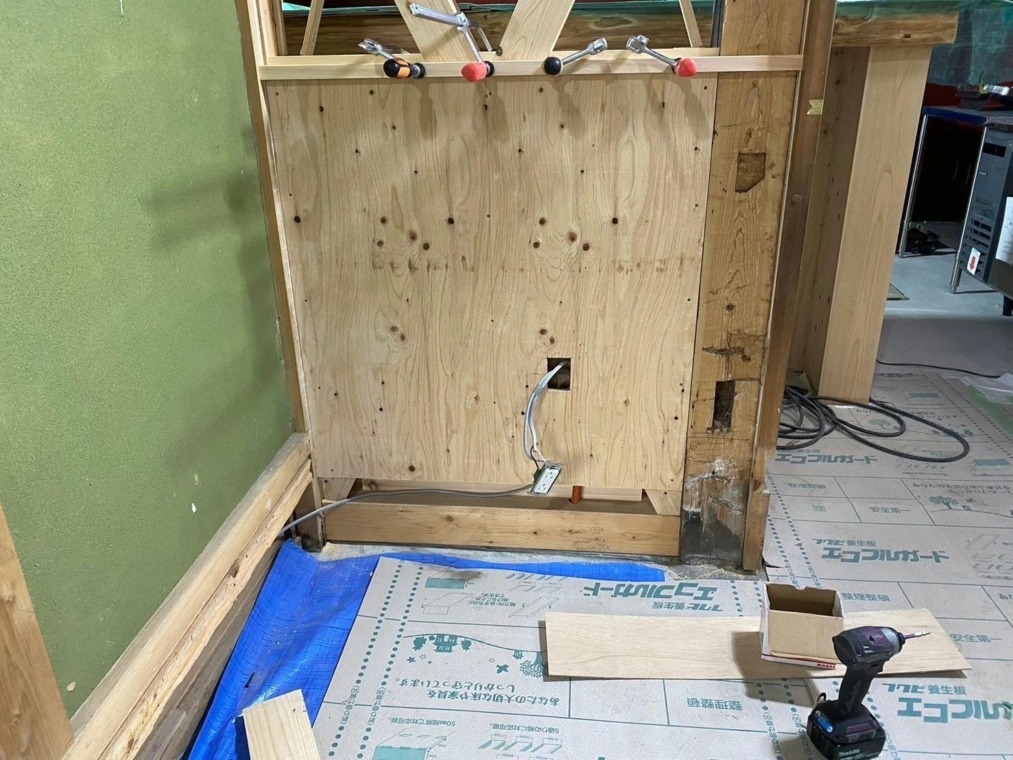この壁の手前にはソファ席を作って、ゆったりできるようにします!