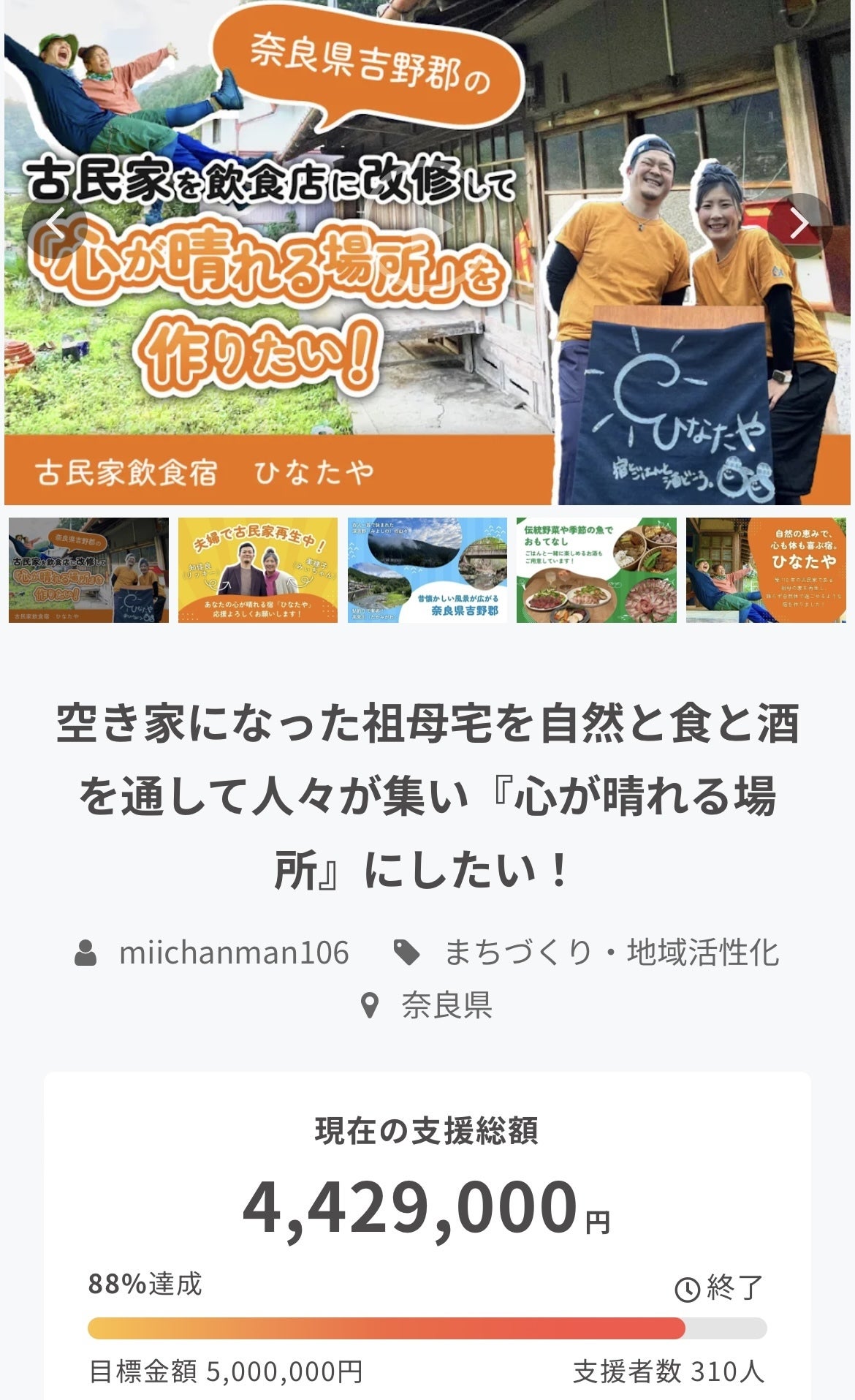 昨日、3/15の23:59をもちまして今回の私たちのプロジェクト「空き家になった祖母宅を自然と食と酒を通して人々が集い『心が晴れる場所』にしたい!」が終了いたしました!