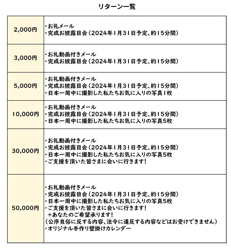 今回私たちのプロジェクトを応援してくださる皆さまに私たちなりの私たちらしいリターンをご用意させていただきました!