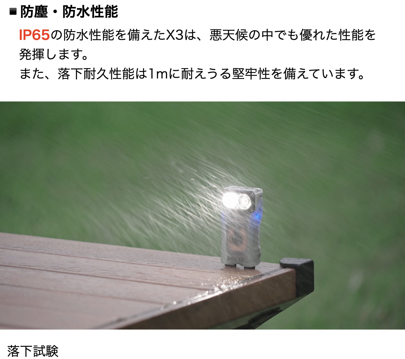 A:防塵防水等級IP65で、いかなる方向からの水の直接噴流を防ぎますが、水中には浸けないでください。