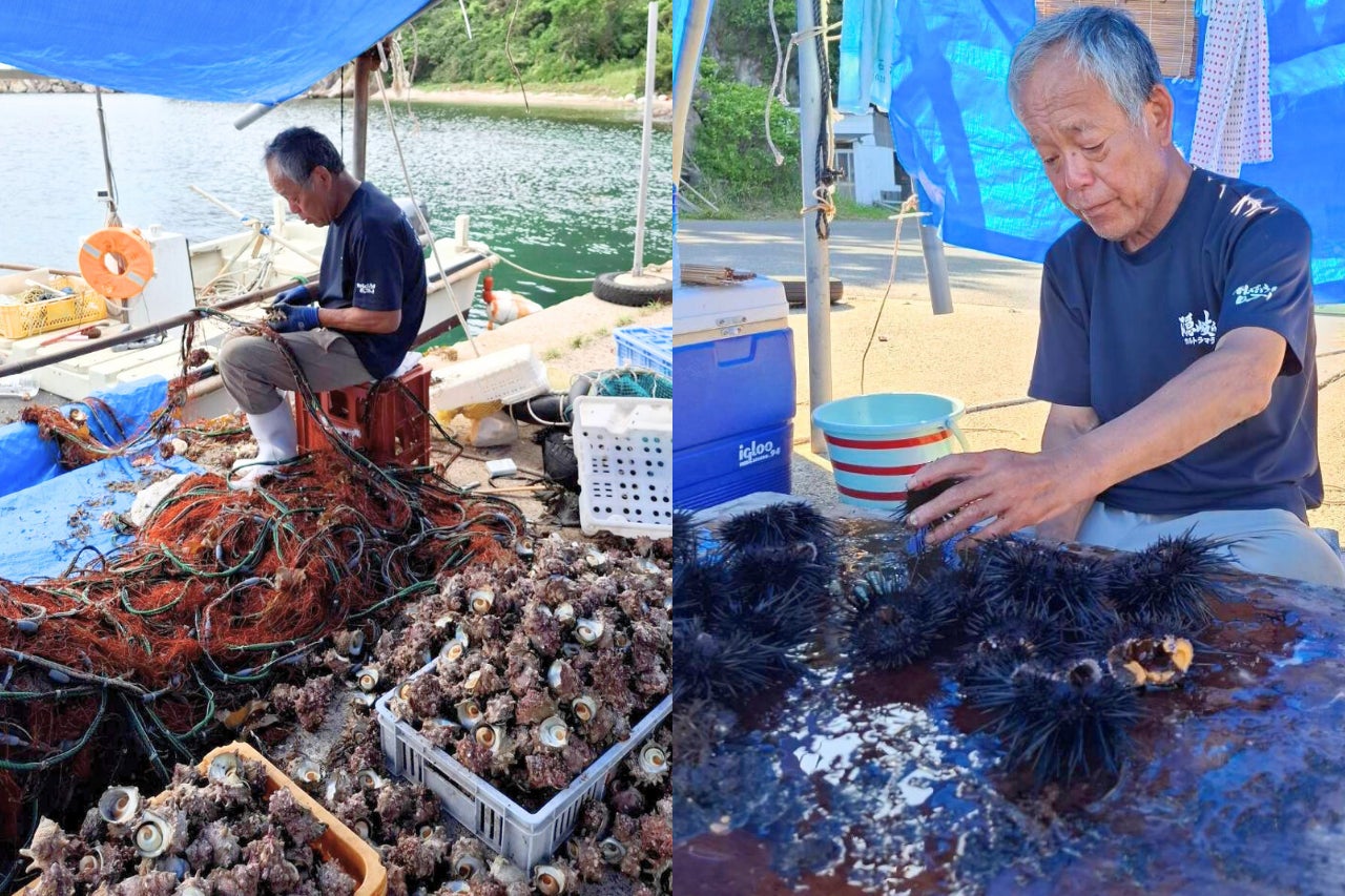 退職後は個人漁をしており、今の時期は素潜りでウニを獲ったりサザエ網漁をしております。