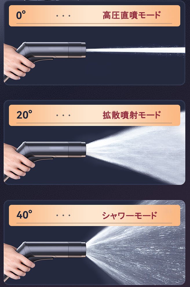 ノズルの前端を回すだけで「高圧直噴」、「拡散噴射」、「シャワー」の3種類の噴射モードの切り替えが可能!ニーズに合わせて様々な使用場面で活用していただけます。