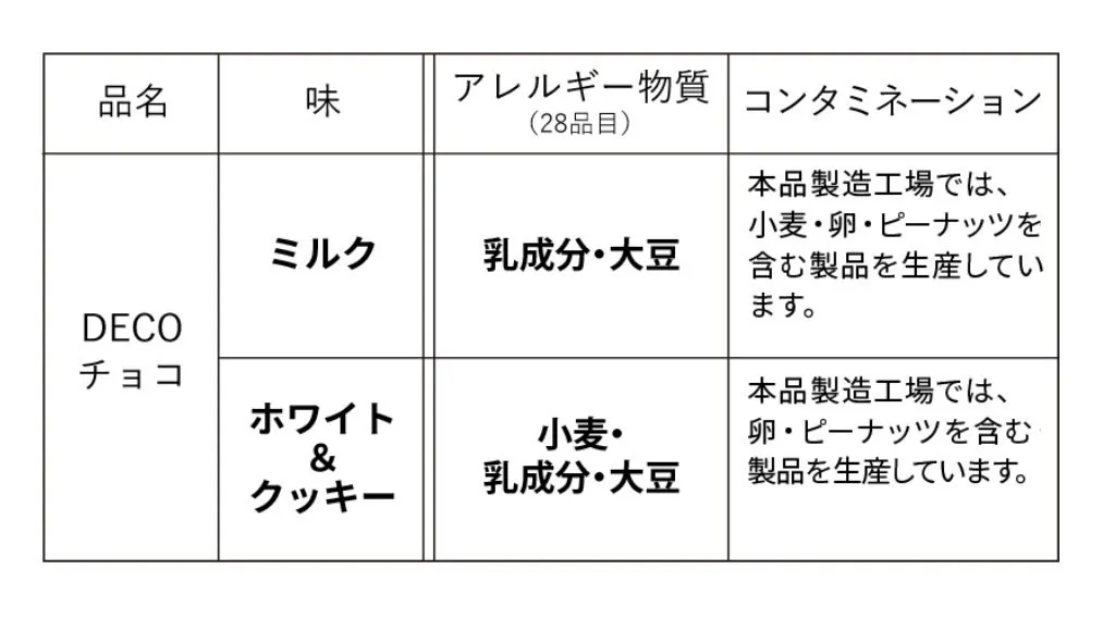 【ホワイト&クッキー】原材料名:ココアクッキー(小麦・乳製品を含む、国内製造)、乳糖、植物油脂、砂糖、全粉乳、ココアパウダー、練乳パウダー、クリーム加工品/甘味料(ソルビトール)、膨張剤、乳化剤(大豆由来)、香料