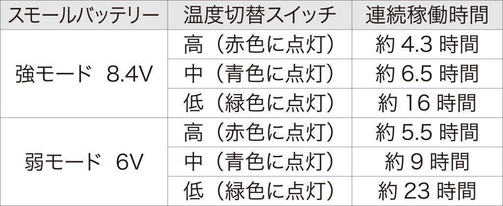 ※上記はスモールバッテリー:弱モード(6V)稼働時の性能目安です。着用条件・環境等により異なりますので留意ください。