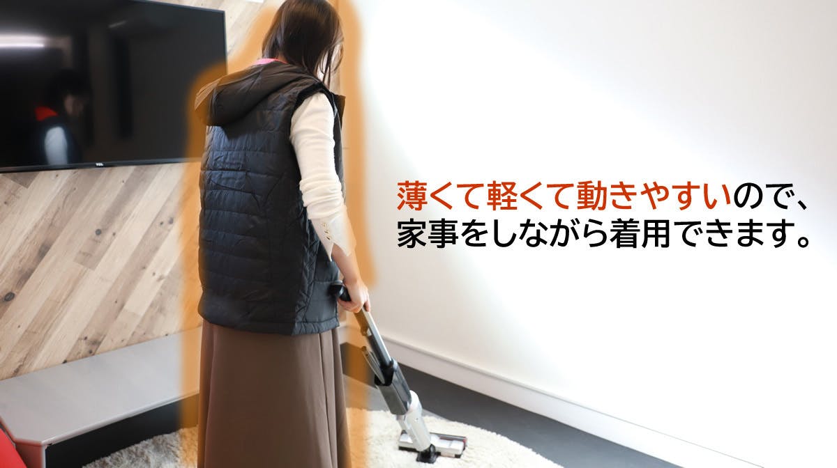 身体を直接温めるから暖房をつけなくても快適に家事ができます。