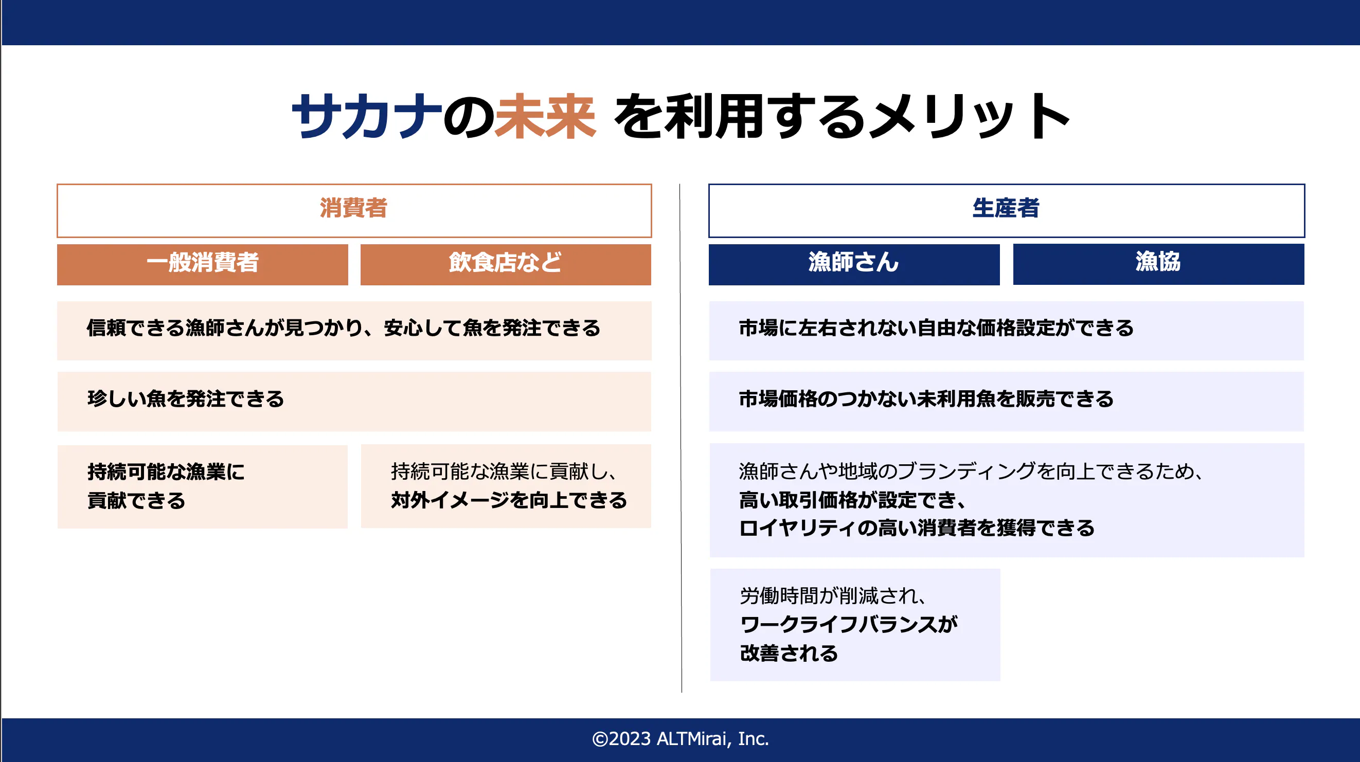 漁師さんが獲った魚だけでなく、漁師さんの漁への思いや人柄に魅力を感じて買っていただいている消費者だからこそ、漁師さんに対して高いロイヤリティが獲得でき、継続購買や、高付加価値での魚の販売が実現できます。