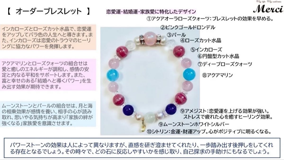 言葉の知名度が高いのでタイトルではパワーストーンと表記しましたが、 「Merci」ではパワーストーンの事をジェムストーンと呼んでいます。意味は同じと思ってもらって問題ありません。