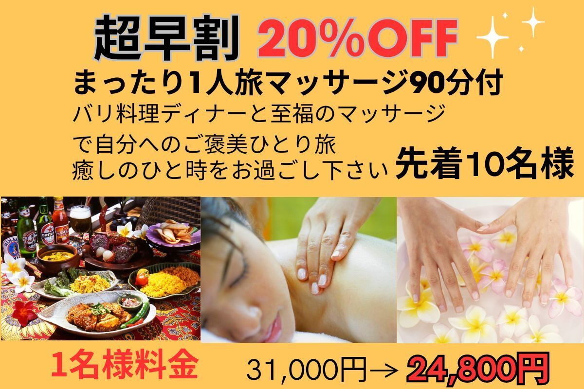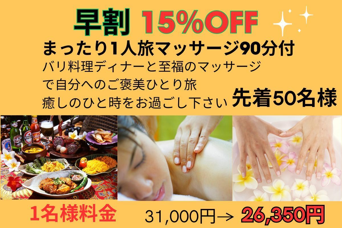 ※バリ式アロママッサージを追加ご希望の場合はプラン販売終了後にご案内いたします「専用予約サイト」で追加オプションとしてお申込み頂けます。(現地精算)