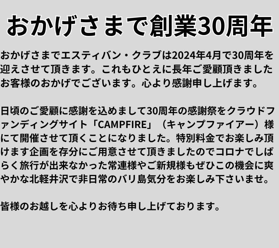 さらに沢山のお客様にこの不思議な空間「軽井沢のバリ島」エスティバン・クラブを知って頂きたいと思いCAMPFIREでの掲載をさせて頂きました。私達夫婦と素晴らしい数名のスタッフでおもてなしさせて頂きます♪