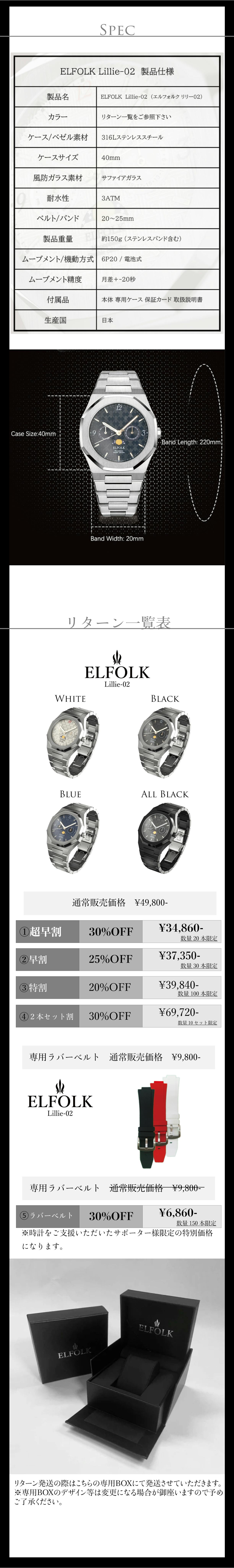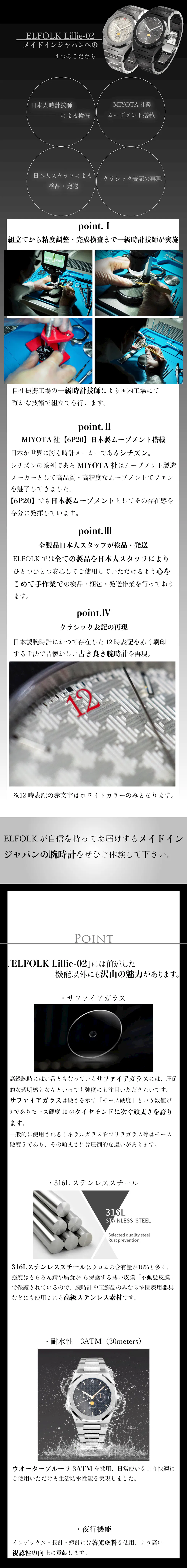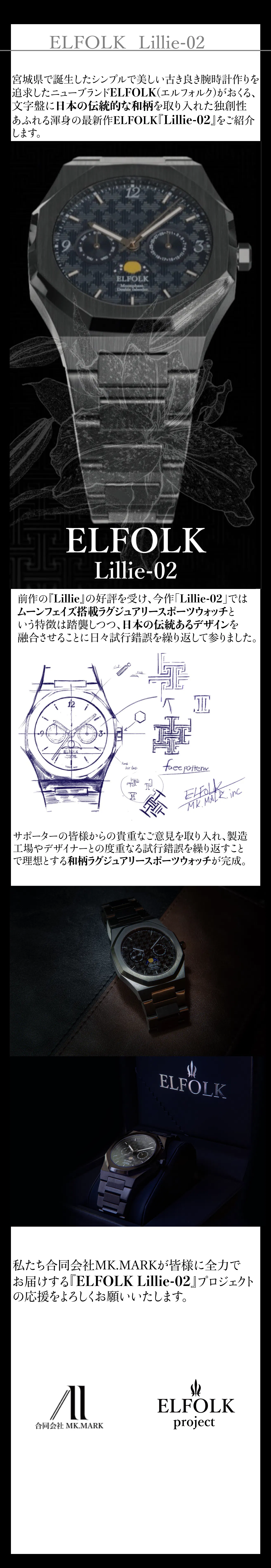 腕時計事業に携わるにつれ制作チームは自社のブランドを立ち上げたいと考えるようになりました。こんな時計があったら良いな、とチーム内で話し合いの中から生まれた腕時計を具現化した製品が当プロジェクト製品第一作目の【ELFOLK Lillie】二作目に【ALSTRO】という作品を生み出し、支援者様の使用感や望む機能を伺うことにより完成したのが今作【Lillie-02】になります。