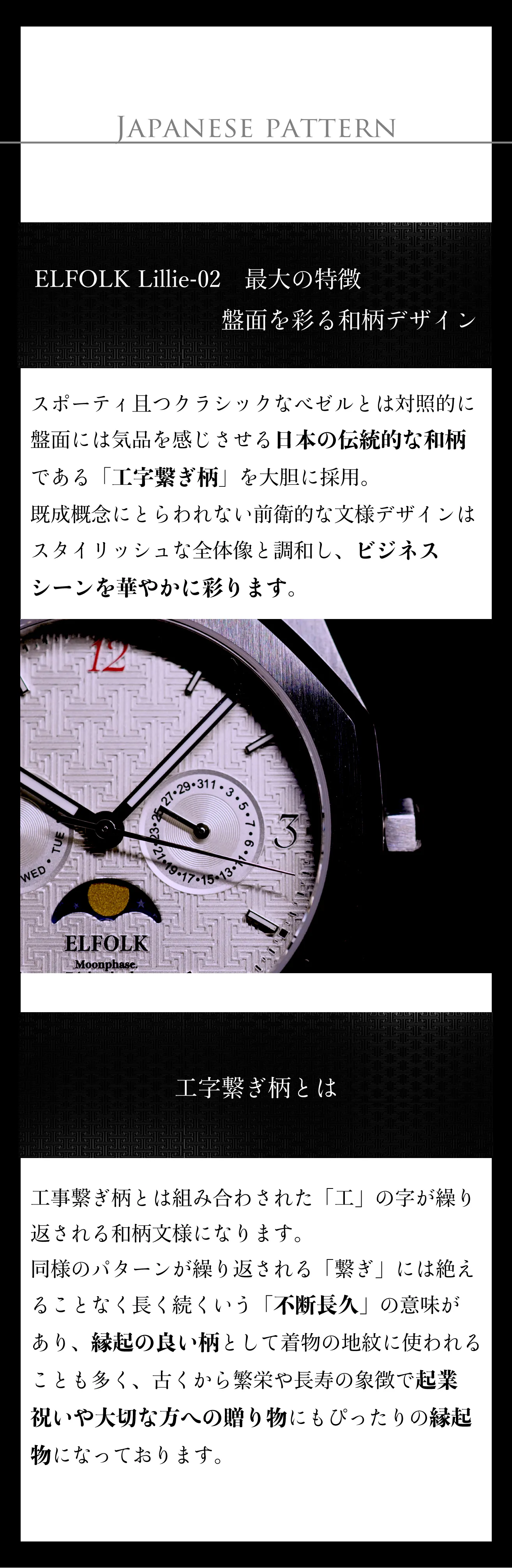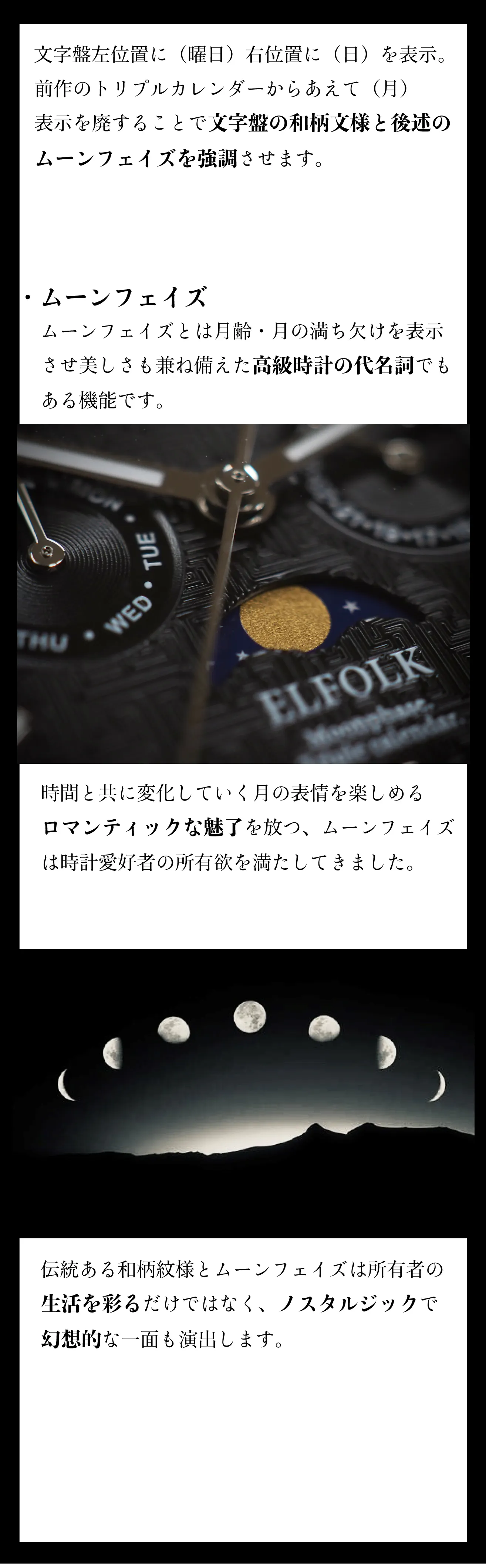 伝統ある柄や古き良き機構のムーンフェイズを最大限活かしその中にもELFOLKらしさを出し融合させることにチーム一丸となり取り組みました。