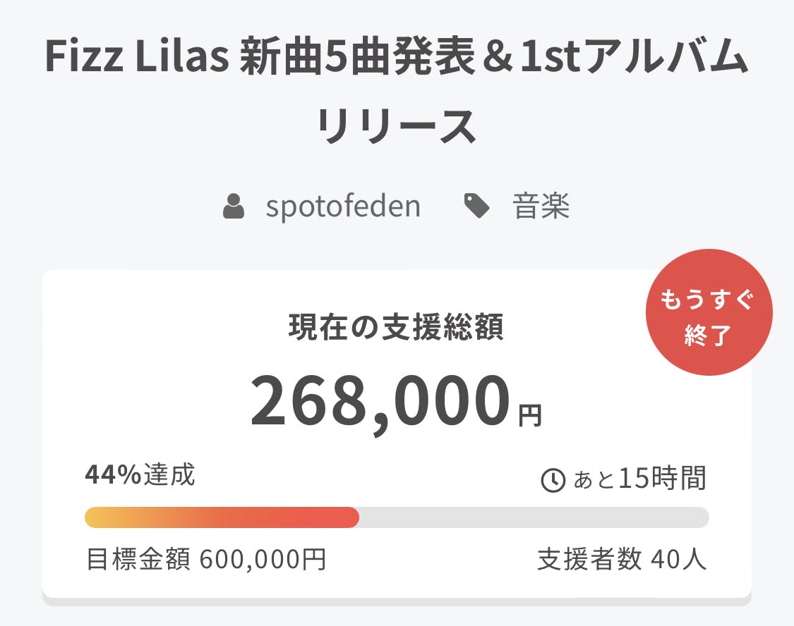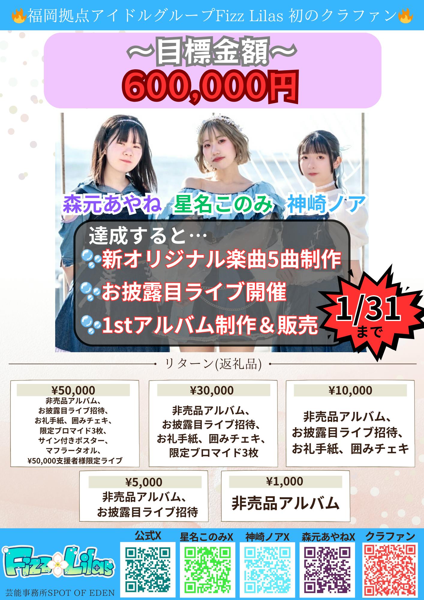 2024/01/31 08:53本日最終日…!!残り15時間となりました。試行錯誤しながら始めたクラウドファンディング。初めてのことでアプローチの仕方も分からずファンの皆様に沢山教えて頂きながらここまで来ました。ありがとうございます!!┈┈┈┈┈┈┈┈┈┈┈┈┈┈┈┈┈┈Fizz Lilasはデビューしてから1年様々なことがありオリジナルメンバーの2人には莫大な不安と負担をかけてしまいました。メンバーが減っていく中、アイドルだから当然と思う方もいらっしゃるかもしれませんが、笑顔を絶やさず明るく前を向いて走り続けてくれた2人には感謝しかありません。オリジナルメンバーが2人になった時点でFizz Lilasは終わる予定でした。そんな中、ど天然で天真爛漫な新メンバーが入ってくれました。正規メンバーに上がるまで沢山苦労をしてきました。それでも諦めずに学業と両立しながら強く一心不乱についてきてくれました。┈┈┈┈┈┈┈┈┈┈┈┈┈┈┈┈┈┈神崎ノア、森元あやねの2名にとってはこのクラファンで出来た曲が初めての自分たちだけのオリジナル楽曲になります。星名このみにとって、そして2人にとっても初のアルバム制作&販売です。初の経験 をファンの皆様と共に良き思い出 にできるよう最後までよろしくお願いします! もっと見る