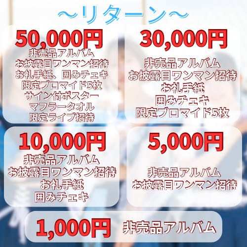 非売品アルバム、お披露目ワンマン招待(5回分)、メンバー全員からのお礼の手紙、囲みチェキ、限定ブロマイド5枚、サイン付きポスター、マフラータオル、50,000円支援者様限定ライブ招待券