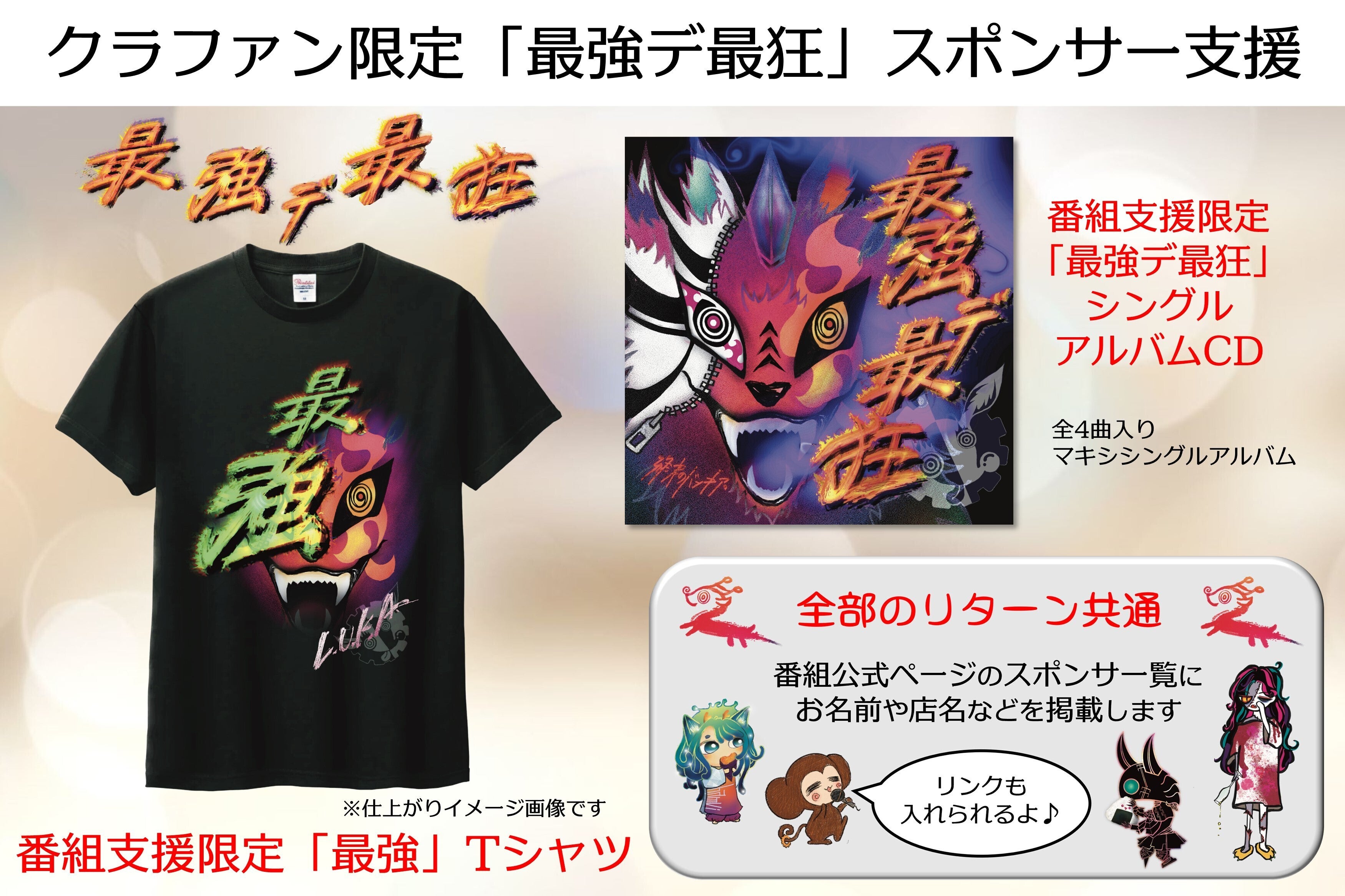 こちらは、「終末のバンギア。」の最新ナンバー「最強デ最狂」のシングルアルバムCDと特製Tシャツのリターングッズがセットになった支援です。