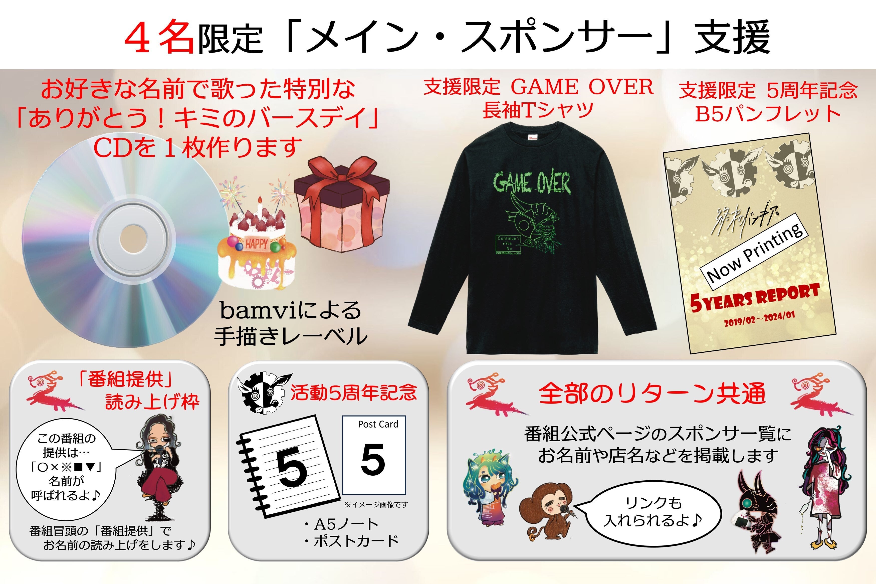 また、トップとメインスポンサー枠には、バンギアのオリジナル誕生日ソング「ありがとう!キミのバースデイ」をお好きな名前で歌った、世界で1枚だけのCDのリターンがあります。