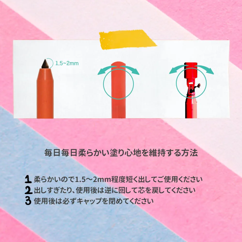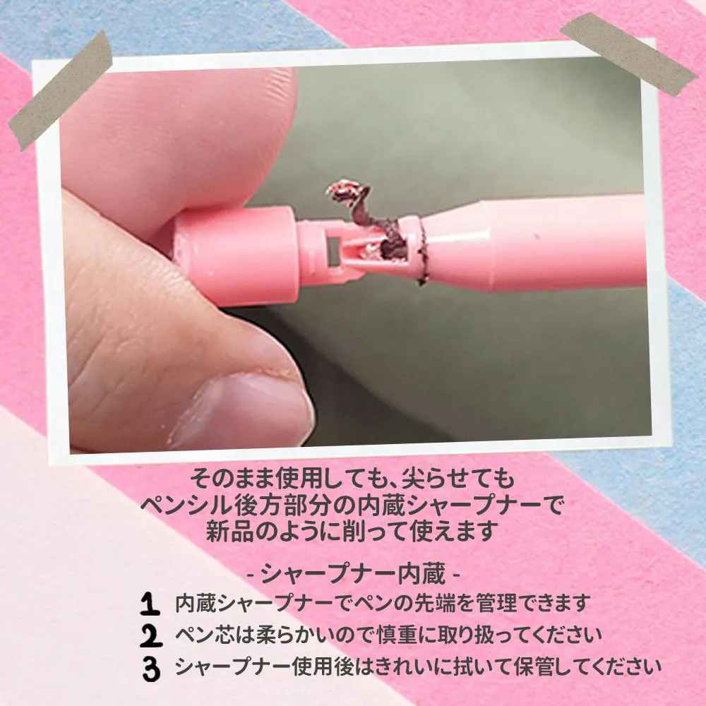 ※時間が経つと密着して落ちにくくなりますので、ぼかして使用したい場合はなるべく早めにぼかしてください。※後方に内蔵のシャープナーを使用してペンの先端を管理できます。