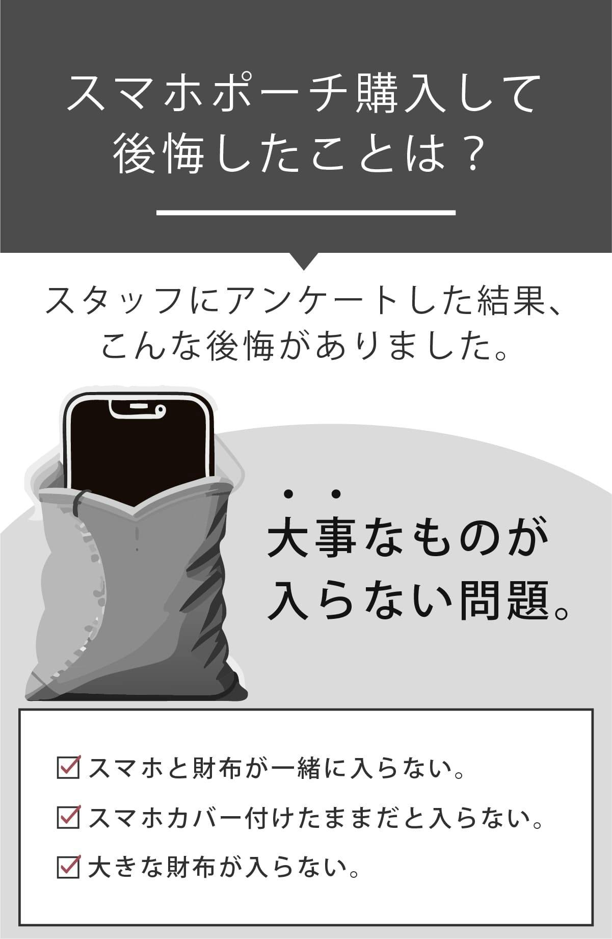 スマートフォンポーチ購入の後悔で目立つのは「ケースのままだと、スマホが入らなかった」「財布が大きいので、スマホと一緒に入らなかった」というケースです。スマートフォンポーチは、365日使うものだから快適であることが大切です。