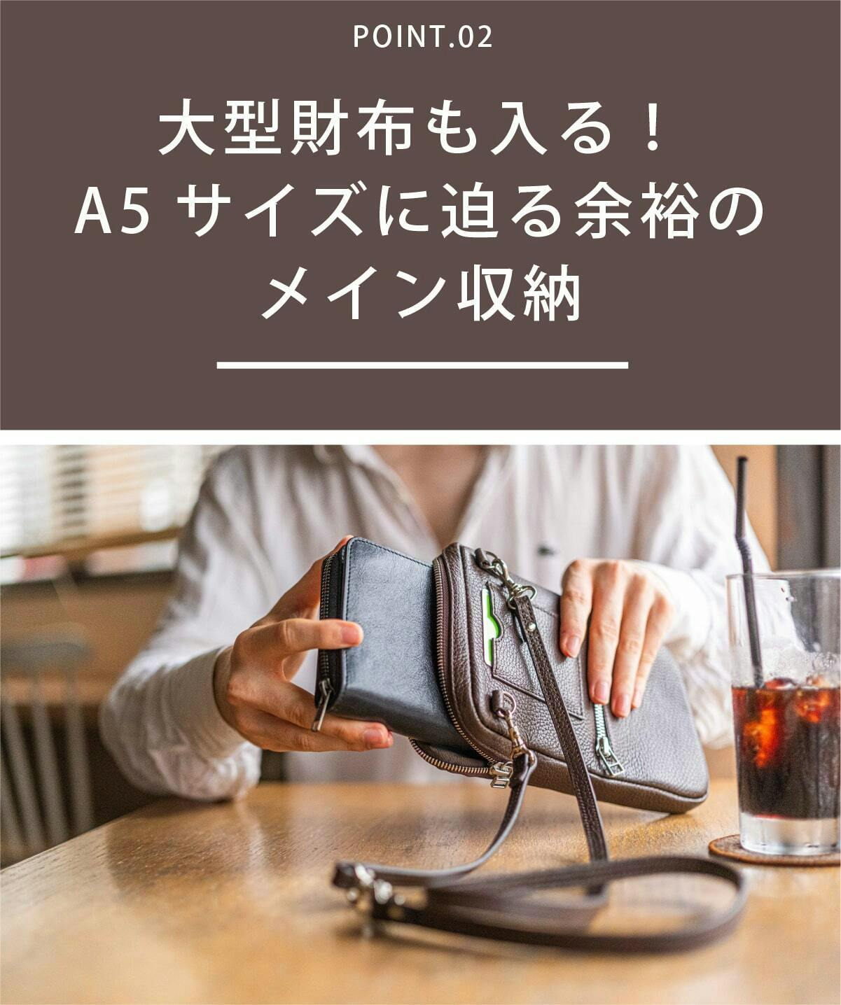 メイン収納部分は大きな財布も入るように、深さ210mm 幅130mm 厚み20mmと、A5サイズの手帳に迫るボリューム感。今まで、スマホポーチに財布が入らなかった方にぜひ、お使い頂きたい。