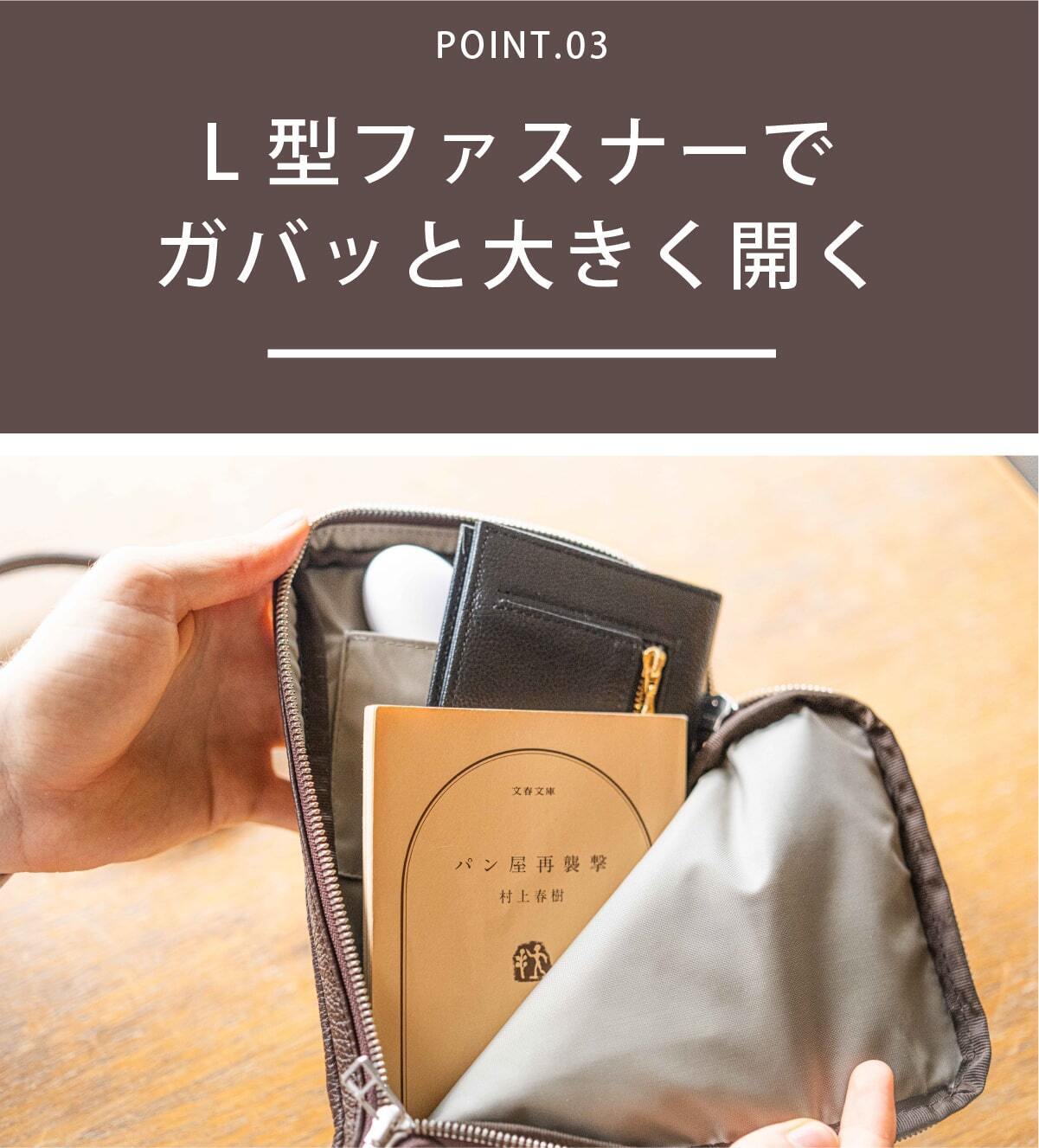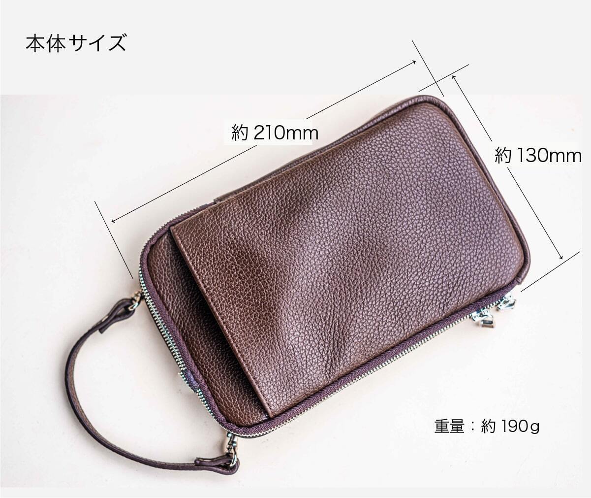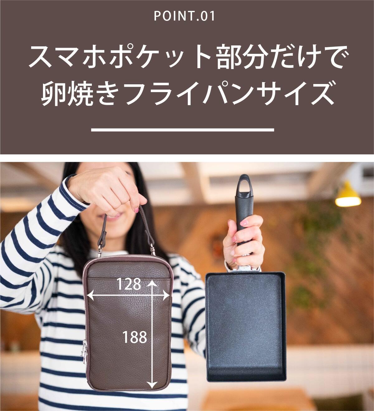 メイン収納部分は大きな財布も入るように、深さ210mm 幅130mm 厚み20mmと、A5サイズの手帳に迫るボリューム感。今まで、スマホポーチに財布が入らなかった方にぜひ、お使い頂きたい。