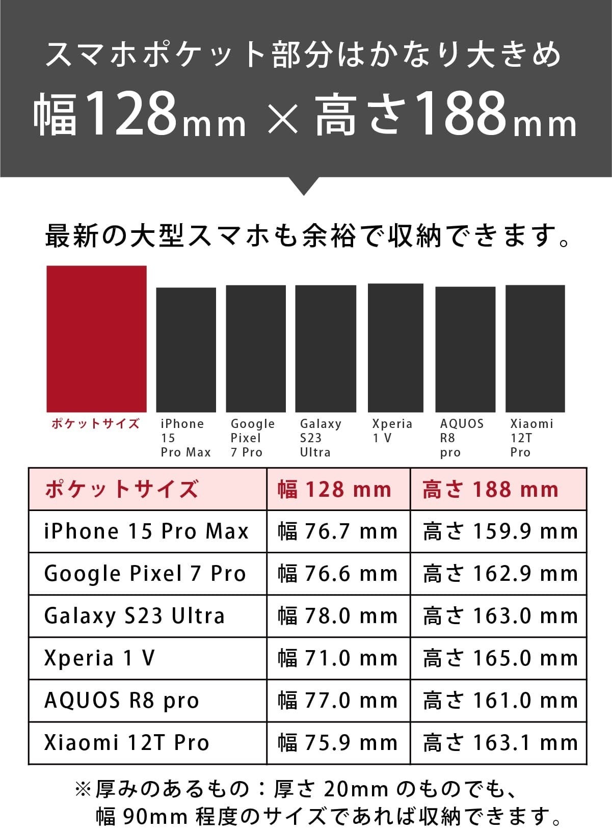 現在(2023年11月時点)、販売されている大型スマートフォンのほとんどがスッポリ入るポケットです。