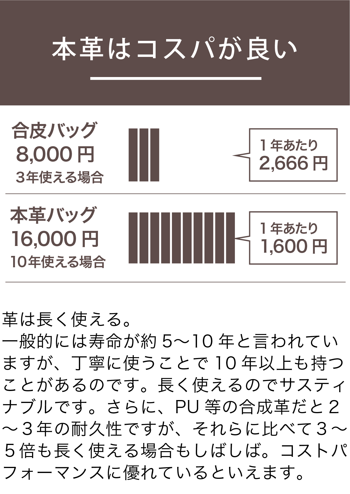 日本製のバッグは、長年培われてきた技術力が魅力です。細部に渡るディテールへのこだわり、高度な職人技術によって生まれるそのクオリティの高さ。大量生産品に比べると高価に感じるかもしれませんが、長年使える点で実はコストパフォーマンスは良いのです。日本人の細やかな気遣いを活かした丁寧な縫製は、世界でも高く評価されています。