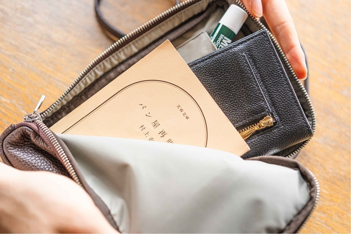 内側は明るく、中身が見やすいグレージュのインナーを採用。素材にはクリンベレNY(抗菌・防臭生地)を採用しました。抗菌加工した素材なので、臭いの元となる菌を抑制することができます。