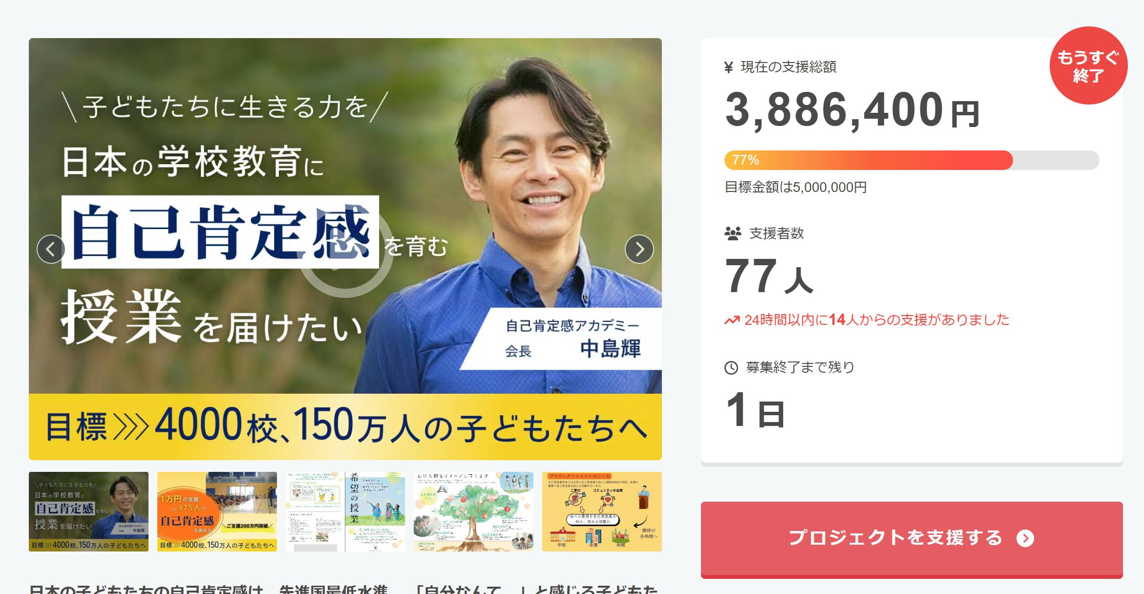 2025/12/31 10:23【本日、最終日です】「日本の未来を、自己肯定感から変える」いよいよ、私たちの挑戦の最終日がやってきました。これまでにご支援・応援・シェアをしてくださった皆さま、心より感謝申し上げます。現在のプロジェクト状況はこちらhttps://camp-fire.jp/projects/890062/viewあと少しで、目標達成。ここまで来られたのは、皆さま一人ひとりの想いと行動があったからこそです。■プロジェクトのはじまり「今の日本に、私たちができることは何か?」「自己肯定感を軸に、社会を良くすることは本当に可能なのか?」そんな問いから、このプロジェクトは始まりました。講座や支援の現場で届く声は、時に胸を締め付けられるようなものばかりです。家族を支える余裕がない子どもを愛したいのに、うまくできない誰からも必要とされていないと感じるそれでも、どうにか希望を持ちたい。どうにか「生きていてよかった」と思いたい。その希望の根っこにあるのが「自己肯定感」なのです。■私たちの約束たとえ環境が厳しくても。たとえ誰かに否定されても。自分の心の中に、「自分を信じる力」「幸せを感じる力」を育てることはできます。それは誰かだけが持つ特別なものではなく、すべての人に必要な“心の土台”です。私たち自己肯定感アカデミーは、この“土台”を、教育・医療・福祉・家庭へと届け続けてきました。そしてこのプロジェクトでは、それを全国へ、そして次世代へと広げていくことを目指しています。■最後のお願いいま、この文章を読んでくださっているあなた。もしこの理念に少しでも共感していただけましたら、最後の最後まで、私たちの背中を押していただけないでしょうか?1人でも多くの方にシェアしていただくご家族や友人に「こんなプロジェクトがあるよ」と伝えていただく可能であれば、ご支援という形で応援していただくそのすべてが、大きな力になります。■今夜、感謝と未来を分かち合う年越しLive開催!本日、大晦日の夜は「年越しクラファンLive」を開催いたします。Zoomで参加されるもよしFacebook Liveで覗き見も大歓迎!ご一緒に、心あたたかく新年を迎えられたら幸いです。Zoom参加はこちらhttps://us06web.zoom.us/j/6385952917ミーティングID: 638 595 2917|パスコード: 222Facebook Live有川大輔・飛田剛 代表のアカウントからご覧いただけます。最後まで読んでいただき、本当にありがとうございます。未来は、誰かが与えてくれるものではありません。私たち一人ひとりが、“自分の心”からつくっていくものです。このプロジェクトは、その第一歩です。どうか最後まで、よろしくお願いいたします。 もっと見る