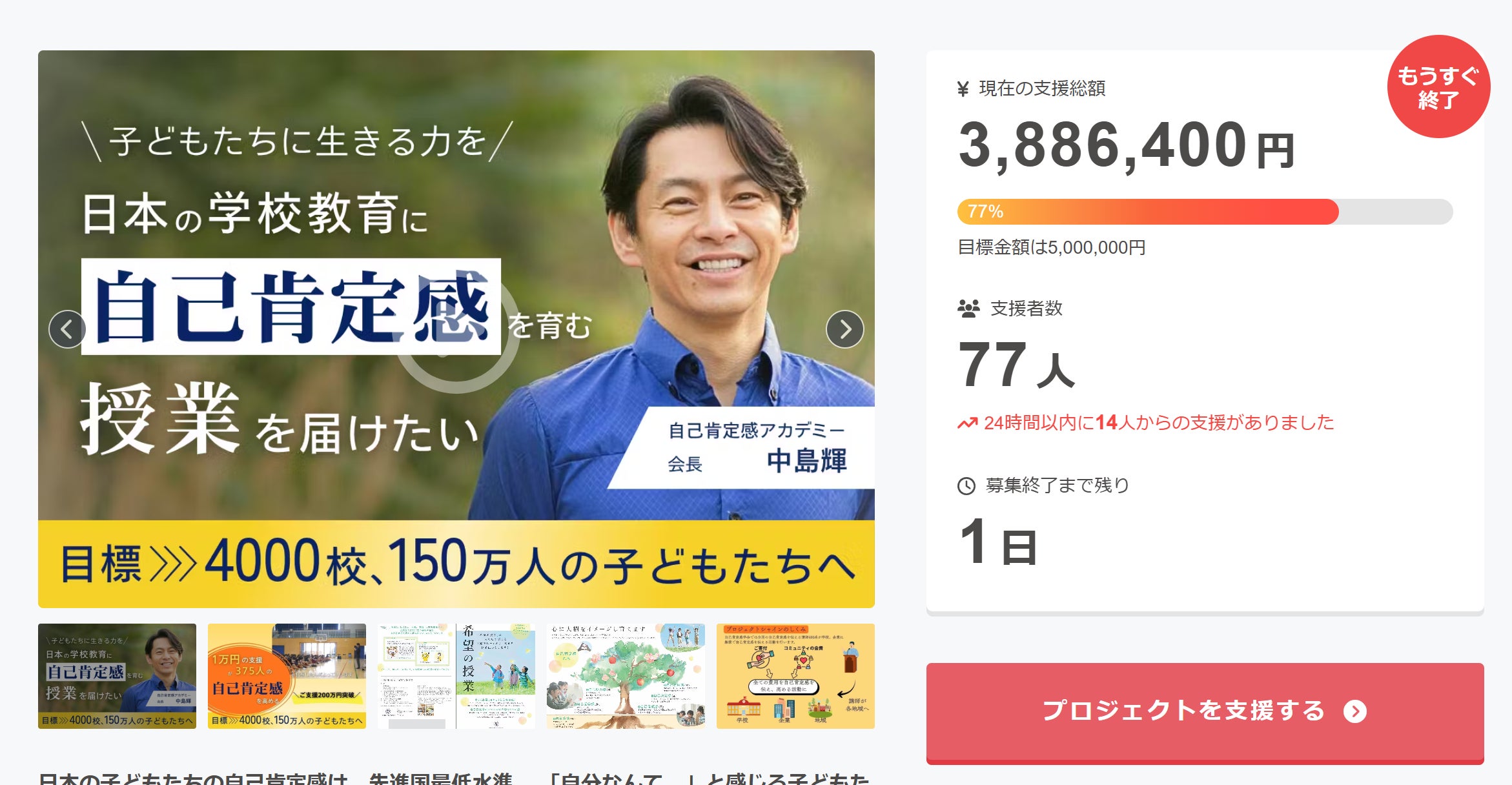2025/12/31 10:23【本日、最終日です】「日本の未来を、自己肯定感から変える」いよいよ、私たちの挑戦の最終日がやってきました。これまでにご支援・応援・シェアをしてくださった皆さま、心より感謝申し上げます。現在のプロジェクト状況はこちらhttps://camp-fire.jp/projects/890062/viewあと少しで、目標達成。ここまで来られたのは、皆さま一人ひとりの想いと行動があったからこそです。■プロジェクトのはじまり「今の日本に、私たちができることは何か?」「自己肯定感を軸に、社会を良くすることは本当に可能なのか?」そんな問いから、このプロジェクトは始まりました。講座や支援の現場で届く声は、時に胸を締め付けられるようなものばかりです。家族を支える余裕がない子どもを愛したいのに、うまくできない誰からも必要とされていないと感じるそれでも、どうにか希望を持ちたい。どうにか「生きていてよかった」と思いたい。その希望の根っこにあるのが「自己肯定感」なのです。■私たちの約束たとえ環境が厳しくても。たとえ誰かに否定されても。自分の心の中に、「自分を信じる力」「幸せを感じる力」を育てることはできます。それは誰かだけが持つ特別なものではなく、すべての人に必要な“心の土台”です。私たち自己肯定感アカデミーは、この“土台”を、教育・医療・福祉・家庭へと届け続けてきました。そしてこのプロジェクトでは、それを全国へ、そして次世代へと広げていくことを目指しています。■最後のお願いいま、この文章を読んでくださっているあなた。もしこの理念に少しでも共感していただけましたら、最後の最後まで、私たちの背中を押していただけないでしょうか?1人でも多くの方にシェアしていただくご家族や友人に「こんなプロジェクトがあるよ」と伝えていただく可能であれば、ご支援という形で応援していただくそのすべてが、大きな力になります。■今夜、感謝と未来を分かち合う年越しLive開催!本日、大晦日の夜は「年越しクラファンLive」を開催いたします。Zoomで参加されるもよしFacebook Liveで覗き見も大歓迎!ご一緒に、心あたたかく新年を迎えられたら幸いです。Zoom参加はこちらhttps://us06web.zoom.us/j/6385952917ミーティングID: 638 595 2917|パスコード: 222Facebook Live有川大輔・飛田剛 代表のアカウントからご覧いただけます。最後まで読んでいただき、本当にありがとうございます。未来は、誰かが与えてくれるものではありません。私たち一人ひとりが、“自分の心”からつくっていくものです。このプロジェクトは、その第一歩です。どうか最後まで、よろしくお願いいたします。 もっと見る