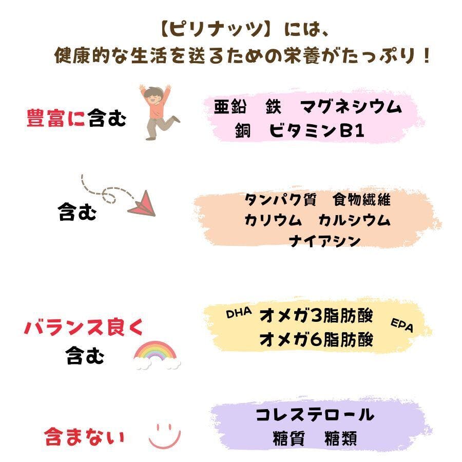 ピリナッツは良質な植物性油脂を豊富に含み、その味はクリーミーでクセがなく、自然の風味豊かなおいしさがあります。特長として、一般的に国内で食べられているナッツや豆類と比較して柔らかく、食べやすい!歯の弱い子供やお年寄りにも楽しめるナッツです。