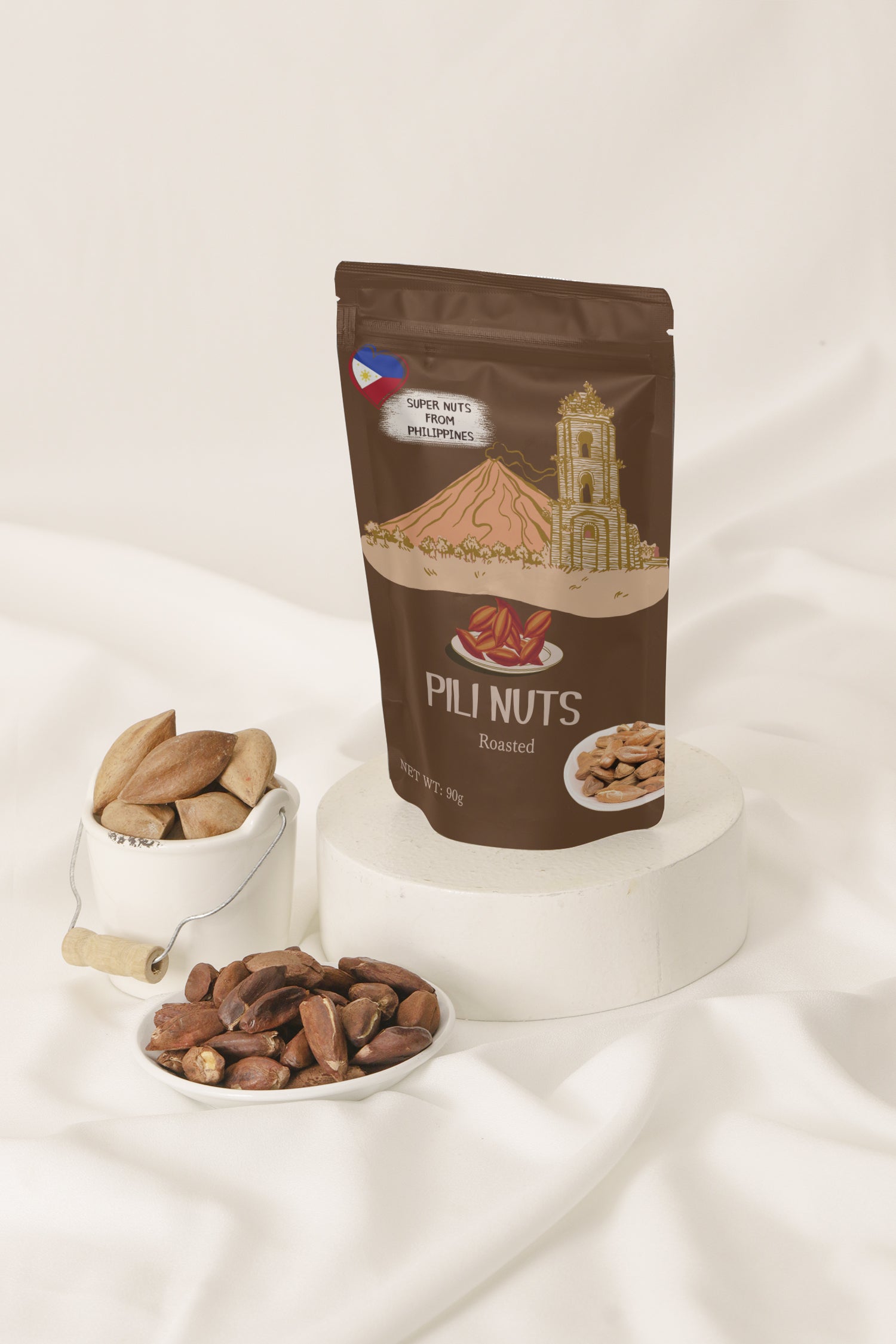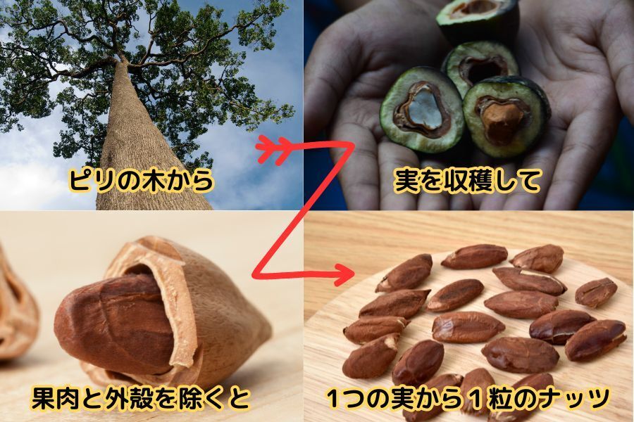 このナッツはピリの木というフィリピン原産の高木から採れる果実の中から取り出した種子部分で、1つの果実からとれるナッツはたったの一粒のみです。種子の形状が様々あり、