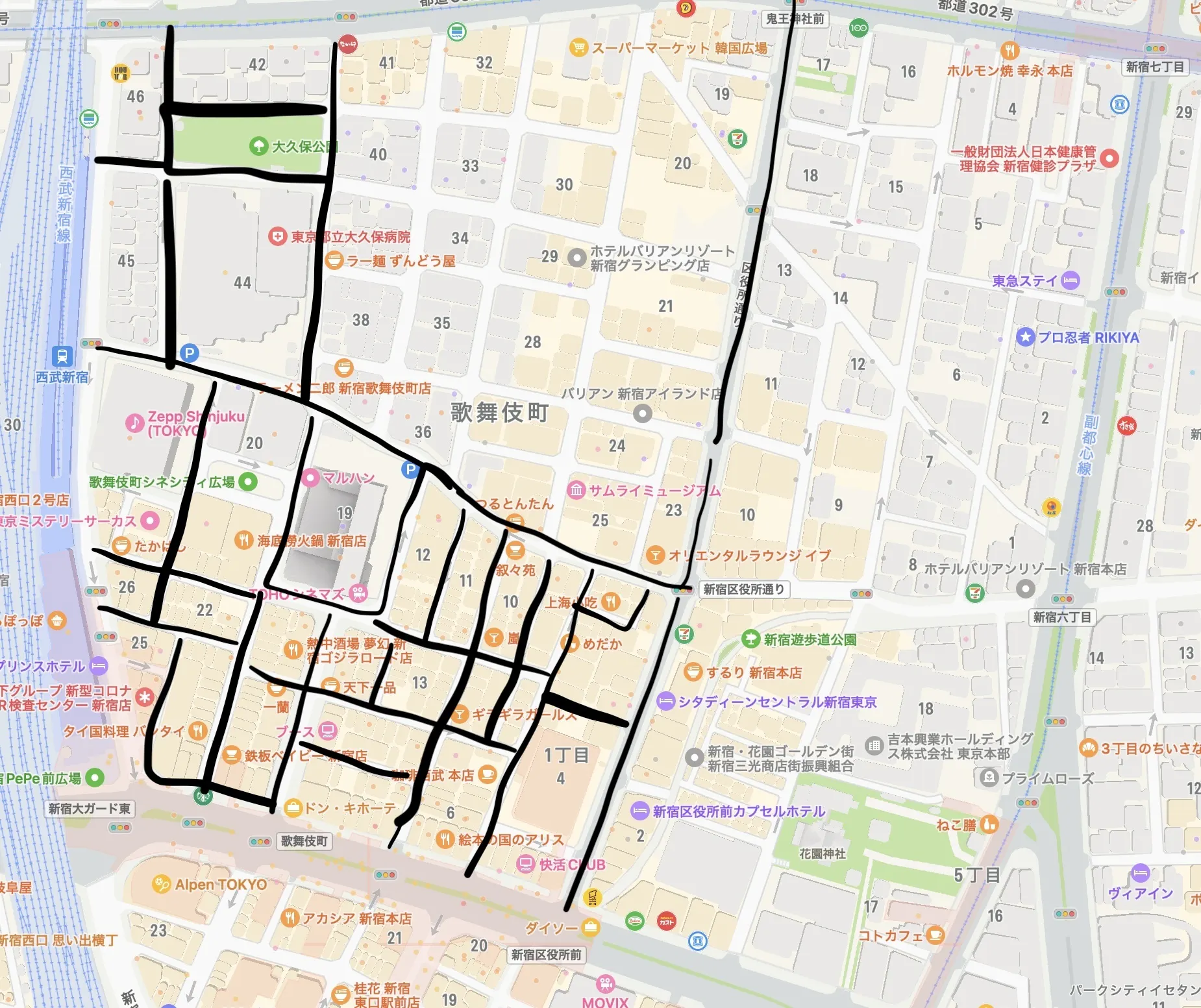 ①に関しましては歌舞伎町には決まった場所でしかエスコートが出来ない形になっています。その場所がこちらになります。