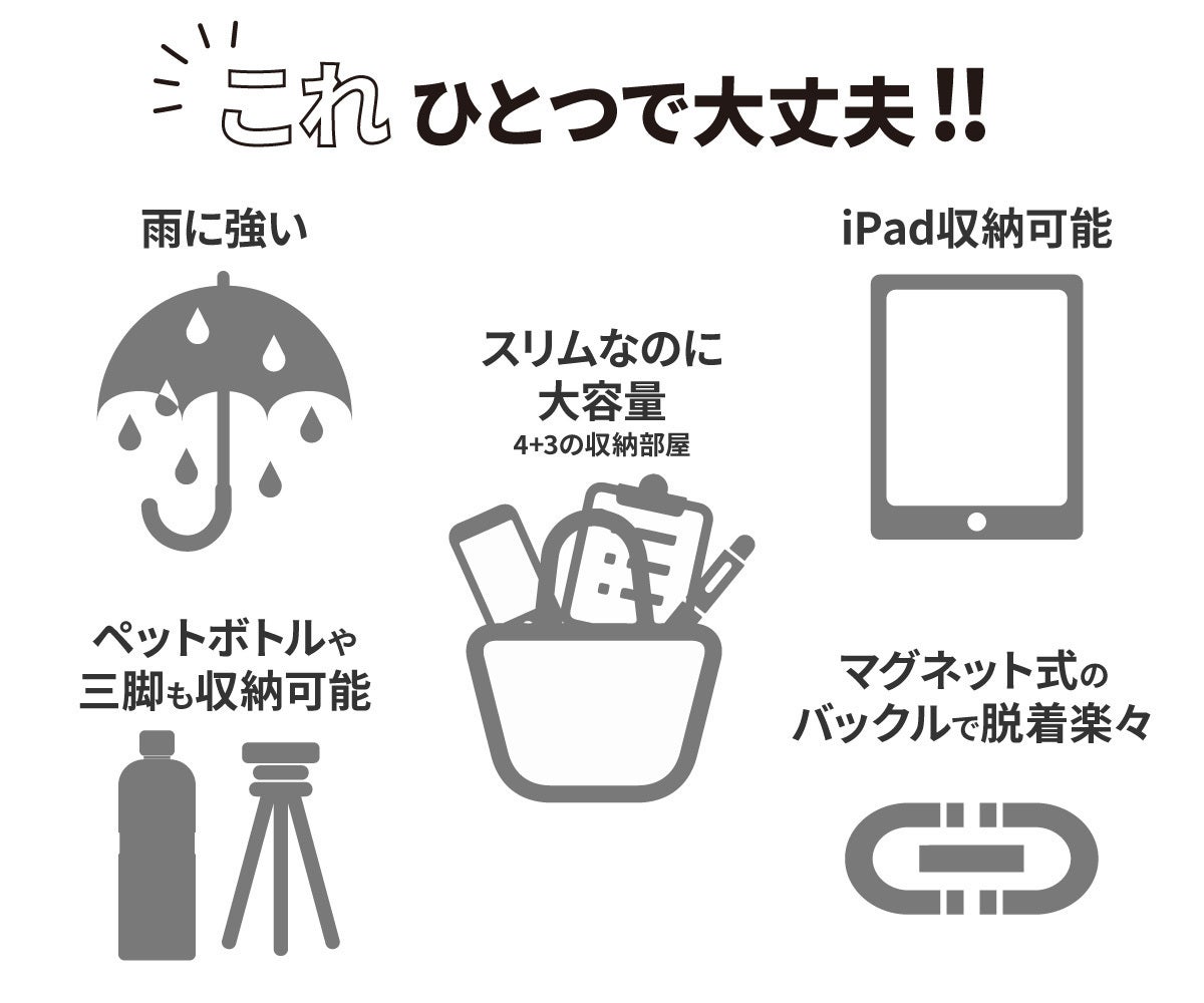 前掛け・右掛け・左掛けのどちらでも使用でき、状況に合わせて幅広いシーンで役立ちます。マグネット装着型のストラップは、力も手間もかからずに着脱できます。紐を持ち上げると外せます。近づけるだけで瞬時に自動ロック!