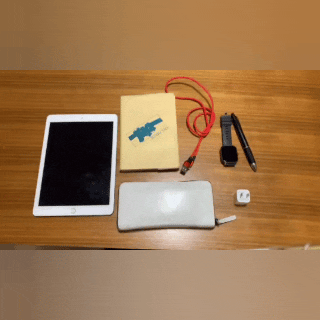 スマホ、iPad、イヤホン、モバイルバッテリー、ケーブル、財布、手帳、鍵