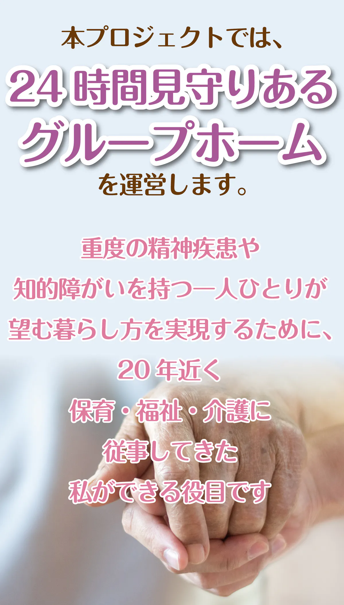 等、寝たきりや認知症にならない限りはグループホームで生活したい方の希望を叶えるため、本プロジェクトを開始しました。