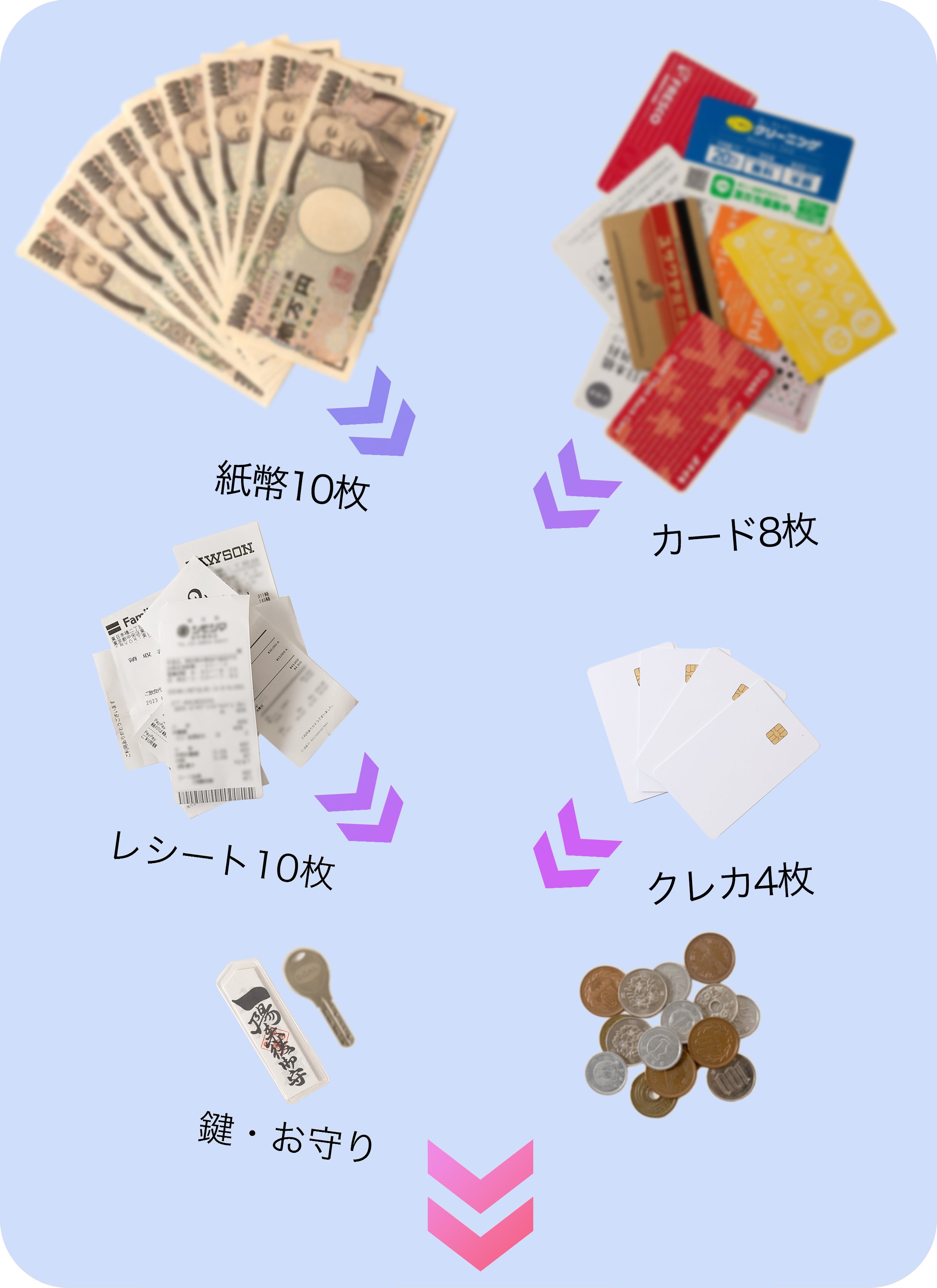 これだけ小さいとどれだけ入るか不安。そう思われるかもしれません。でも心配ありません。お札もカードも全て普通のお財布と比べても何の遜色なく、無理なく入ります。