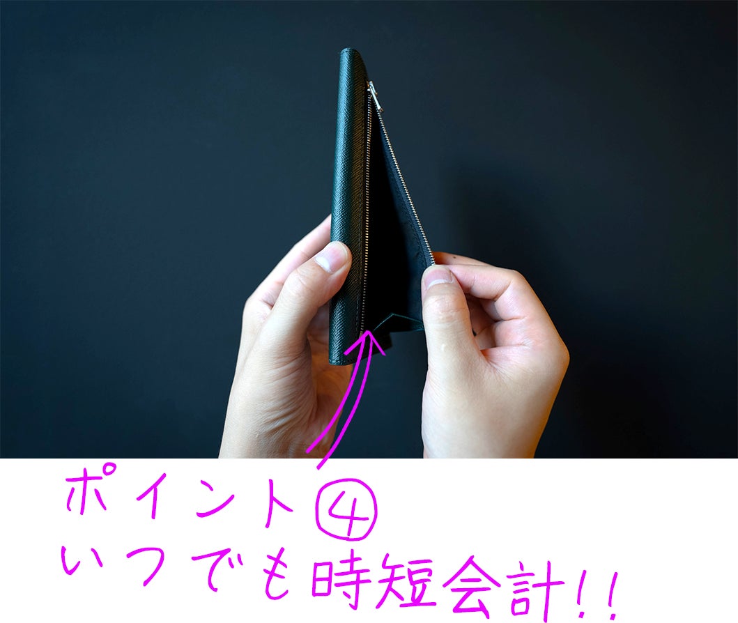 背面小銭ポケットを採用しているので、少額会計の時にお財布を開く手間が省けてスムーズに会計可能です。また、小銭の厚さによってお財布が開いてしまわないようになっています。