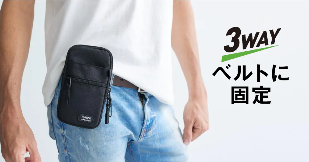 ポーチ裏面のベルトループにベルトを通すことでしっかり固定できます。