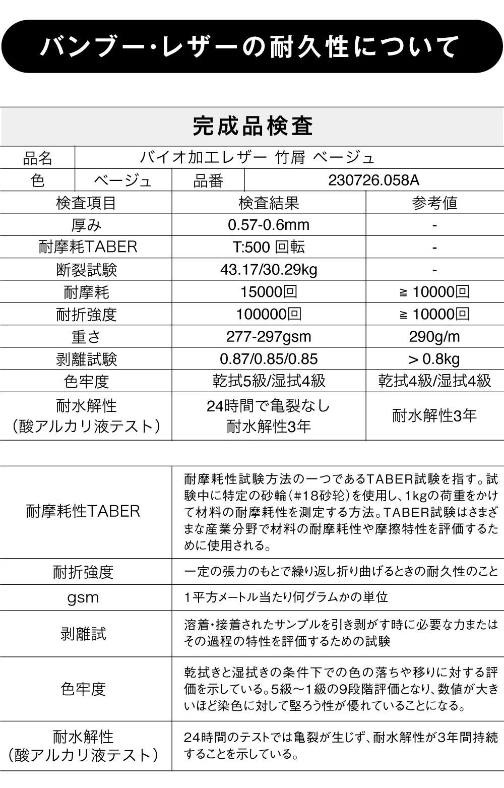 その竹屑と水性PU(水溶性ウレタン樹脂の総称)を合成して作られており、従来の合成・人口皮革よりも石油由来の原料の使用を抑えています。