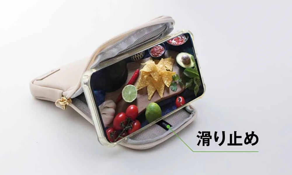 メインポケットの内側に滑り止めをつけることで、食事中、オンライン会議、乗り物での移動時に使えるスマホのスタンド機能を実現しました。