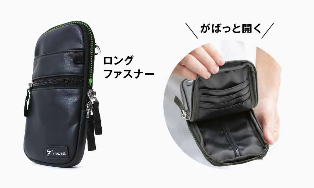 また、ロングファスナーで「がばっと開く」を実現し、スマホやカードが取り出しやすくなっています。