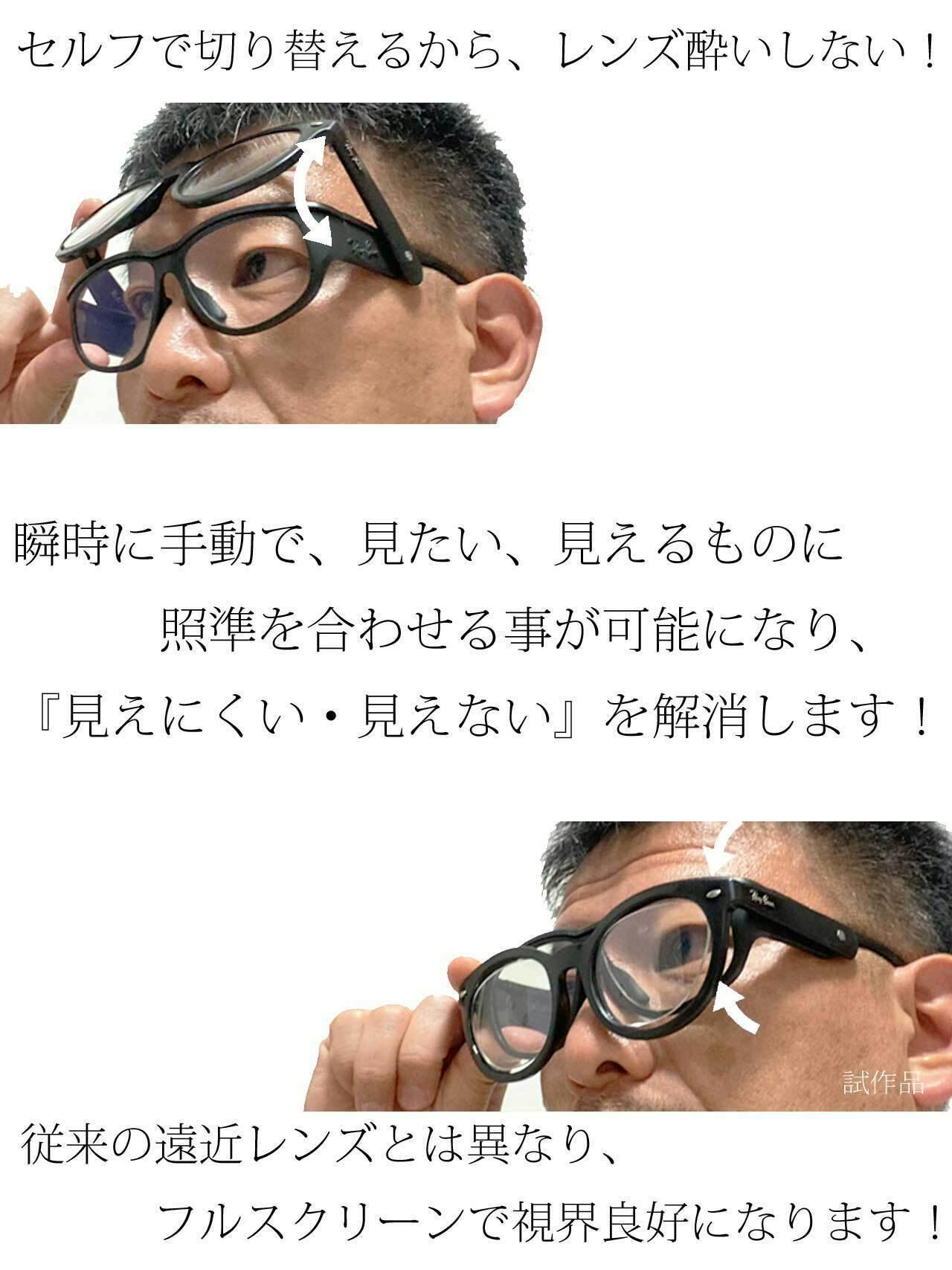 今回のフレームは、前方のフレームをスライドする事によって瞬時に度を変える事が出来ます。フルスクリーンで、見る事が出来る事から不快感を軽減する事は、2つのメガネを使用していた私自身が実証しております。遠近両用メガネのレンズの酔いからも解放され、快適な時間を過ごす事が出来ました。会社のアドレスから転送されたお客様からの連絡を読み違える事もなくなり、たくさんの資料を待ち運びながら瞬時にスライドさせる事であわてる事もなく対応する事も出来ました。