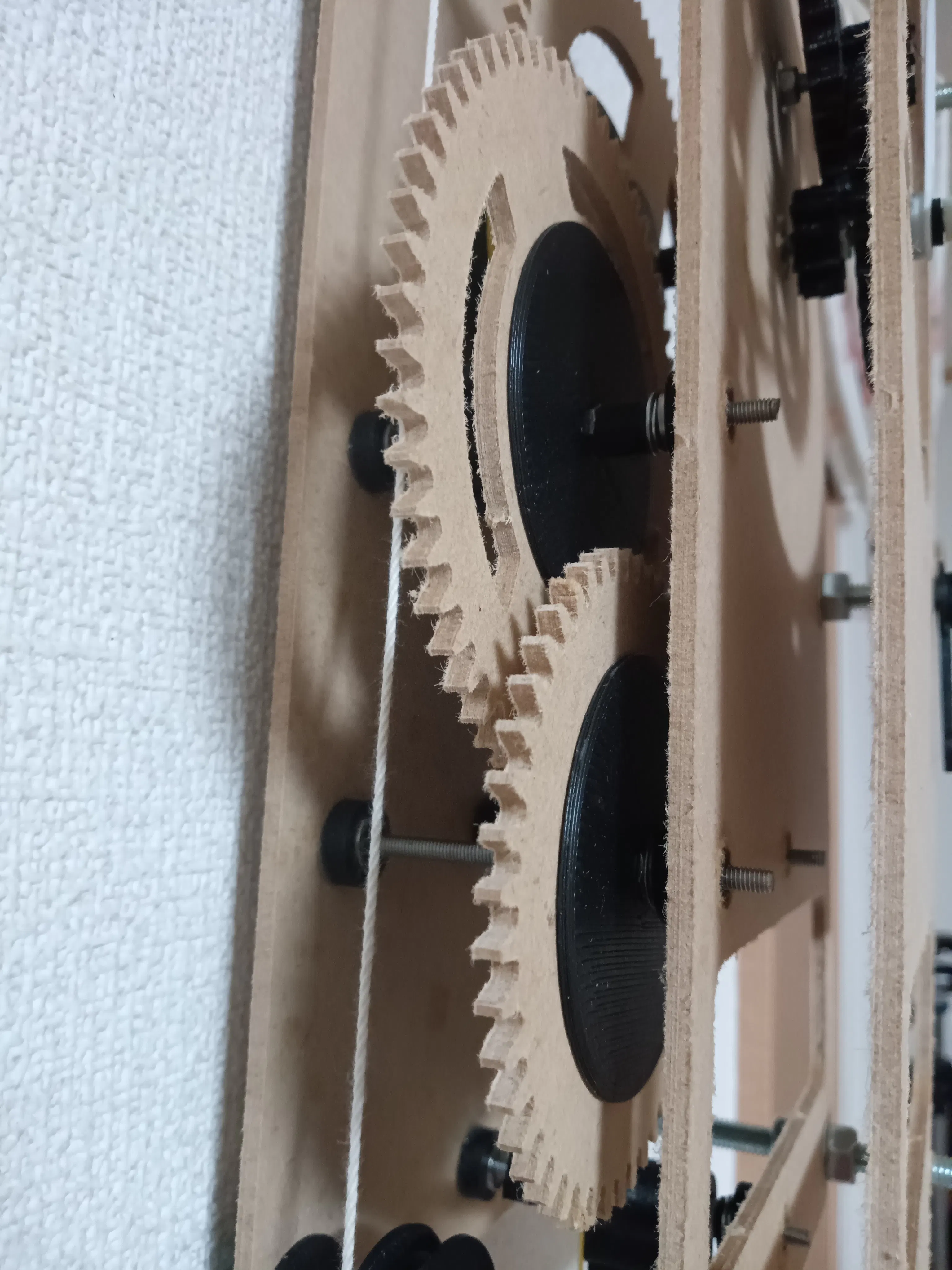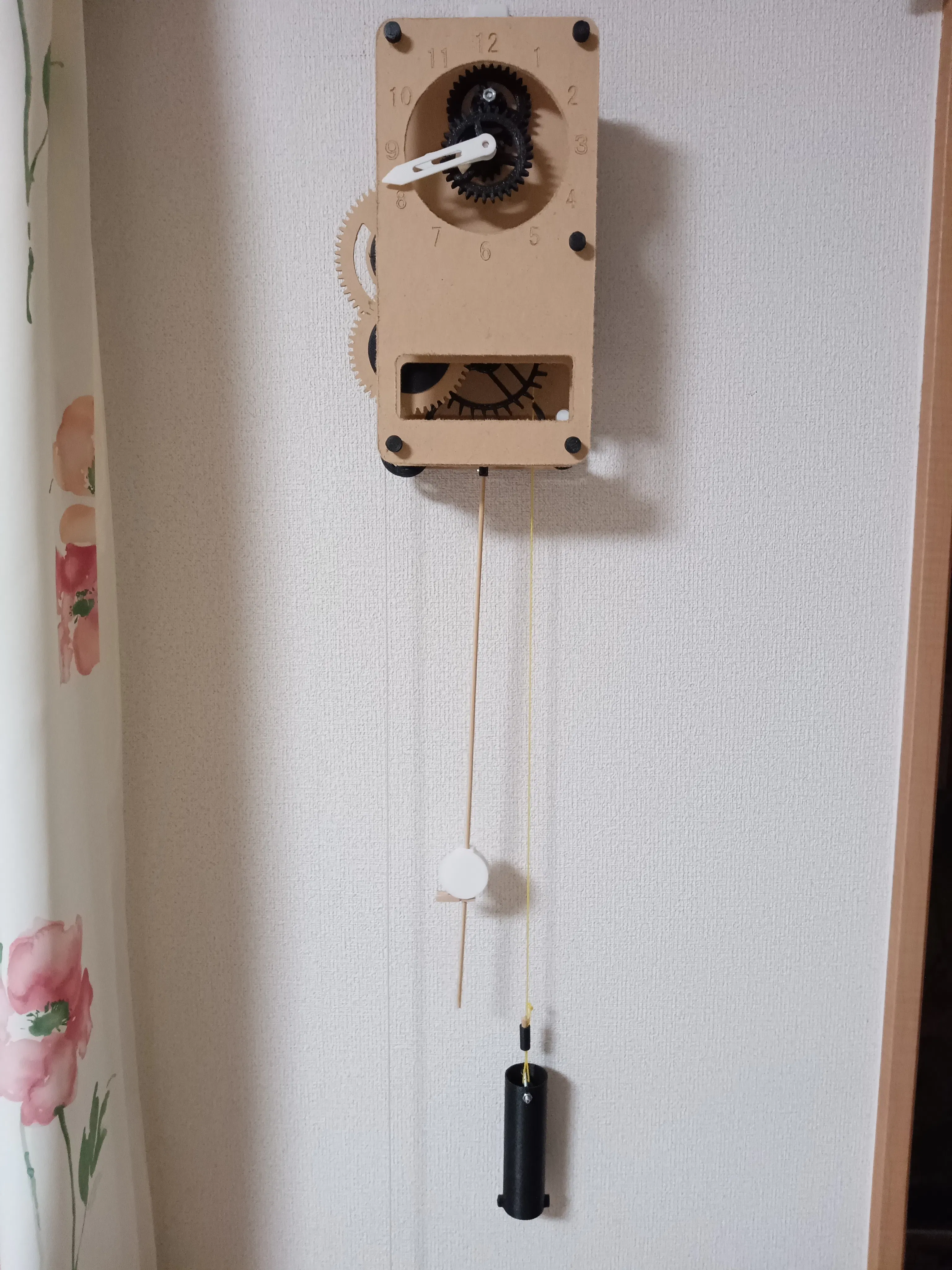 時計のムーブメントはお手製の「重錘式振り子」≒「錘の重さで動き、振り子の原理で時を刻む」時計です。何もしなければ日差-30~+30分はザラですが、振り子の位置を調整すれば1時間に±30秒の誤差くらいまでなら修正可能です。精度の高さは求めず、錘と振り子で動く「機械」を「組み立てる」作業と、出来上がっても実際に動くまでの「調整の時間」を通じてなんで動くのか「探求心」を楽しむのを目的として頂ければと思います。