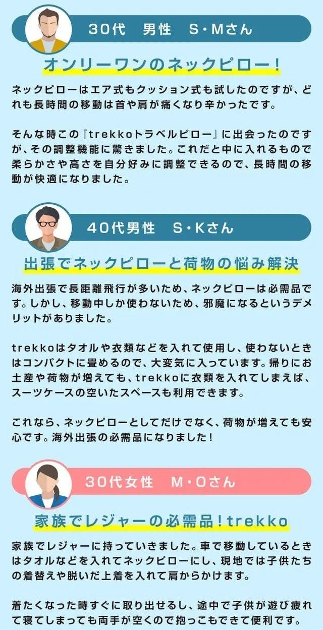 そんな経験からもっと快適で楽しい旅ができるようにと「trekko トラベルピロー」を企画しました。
