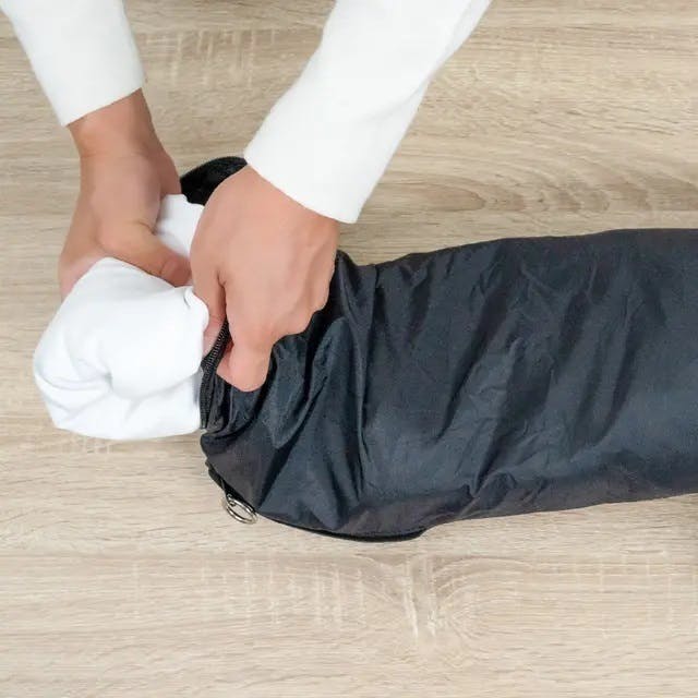 手のひらサイズのポーチを広げ、衣類を詰めればピローの完成。