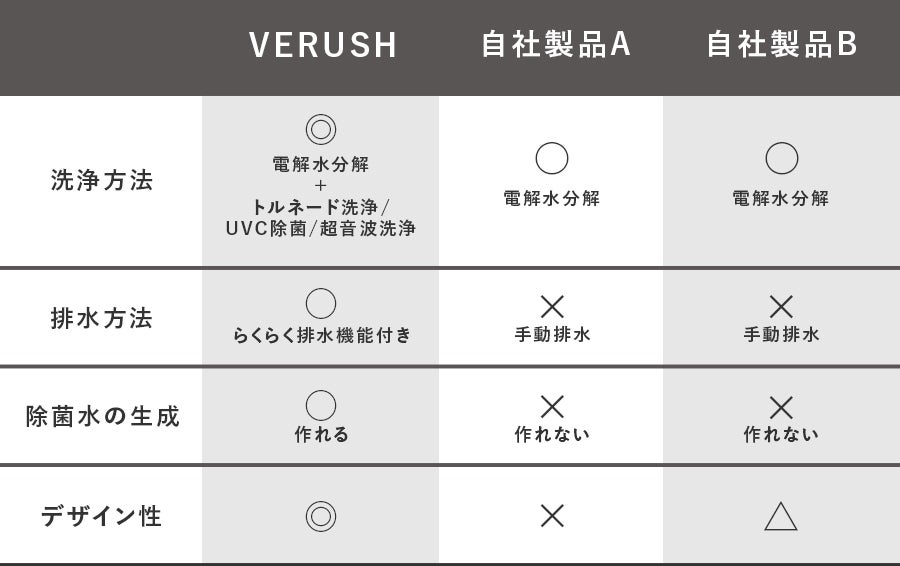 VERUSHは電解水分解、トルネード洗浄、UVC除菌、超音波洗浄を組み合わせることで頑固な汚れを協力洗浄します。