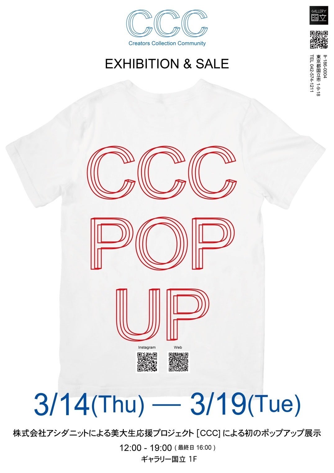 学生応援Tシャツ「CCC」POPUP最終日となります。本日 16:00まで ギャラリー国立にて展示を行っております。是非 お立ち寄りください!!