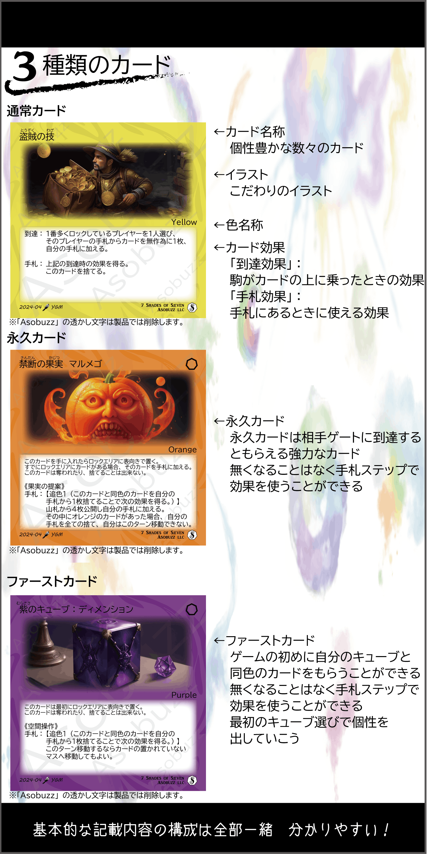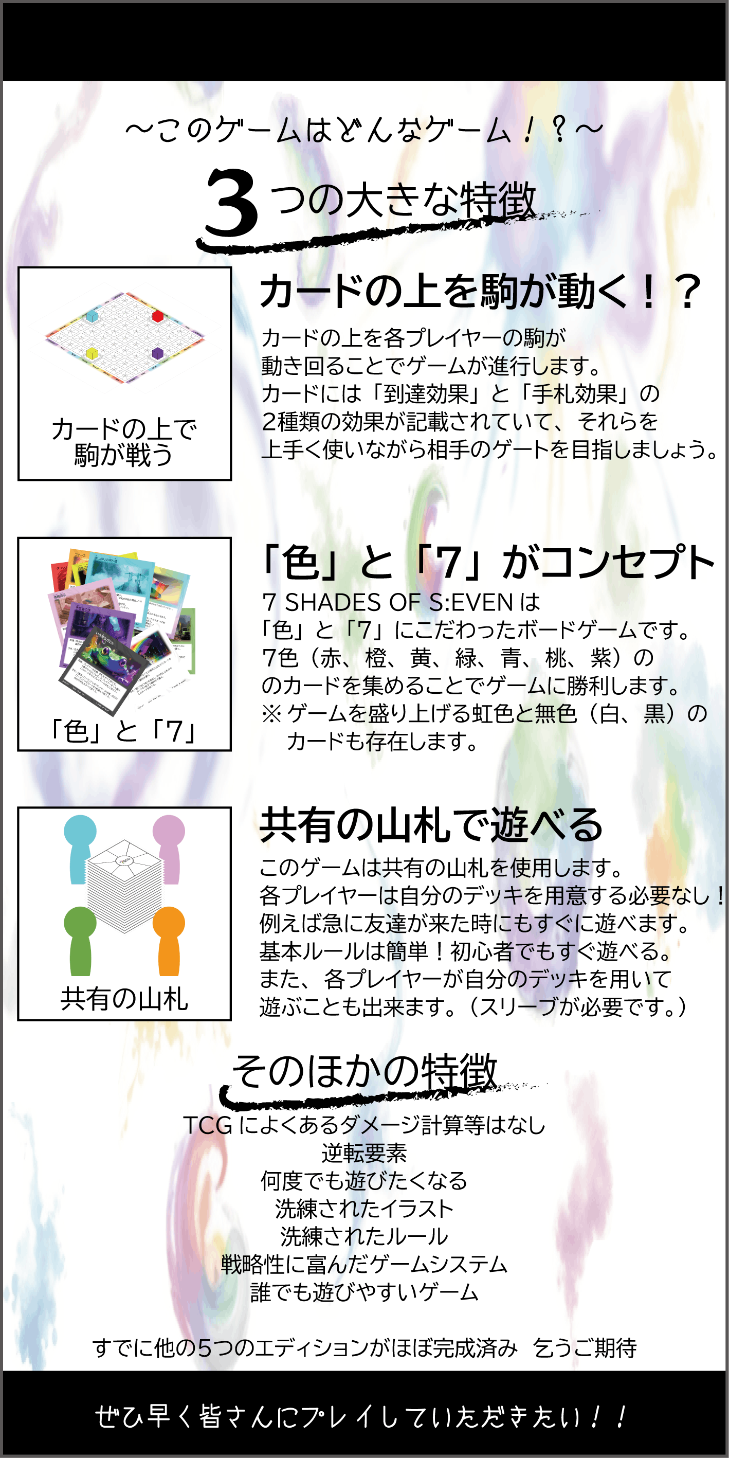 本プロジェクトは、ボードゲームやカードゲーム大好きな新進気鋭のゲームクリエイターYGM氏が、TCG(トレーディングカードゲーム)とボードゲームの概念を融合し、洗練させたゲーム「7 SHADES OF S:EVEN(シェイズオブセブン)」の製品化を目的としたプロジェクトです。(すでに特許案件です。)