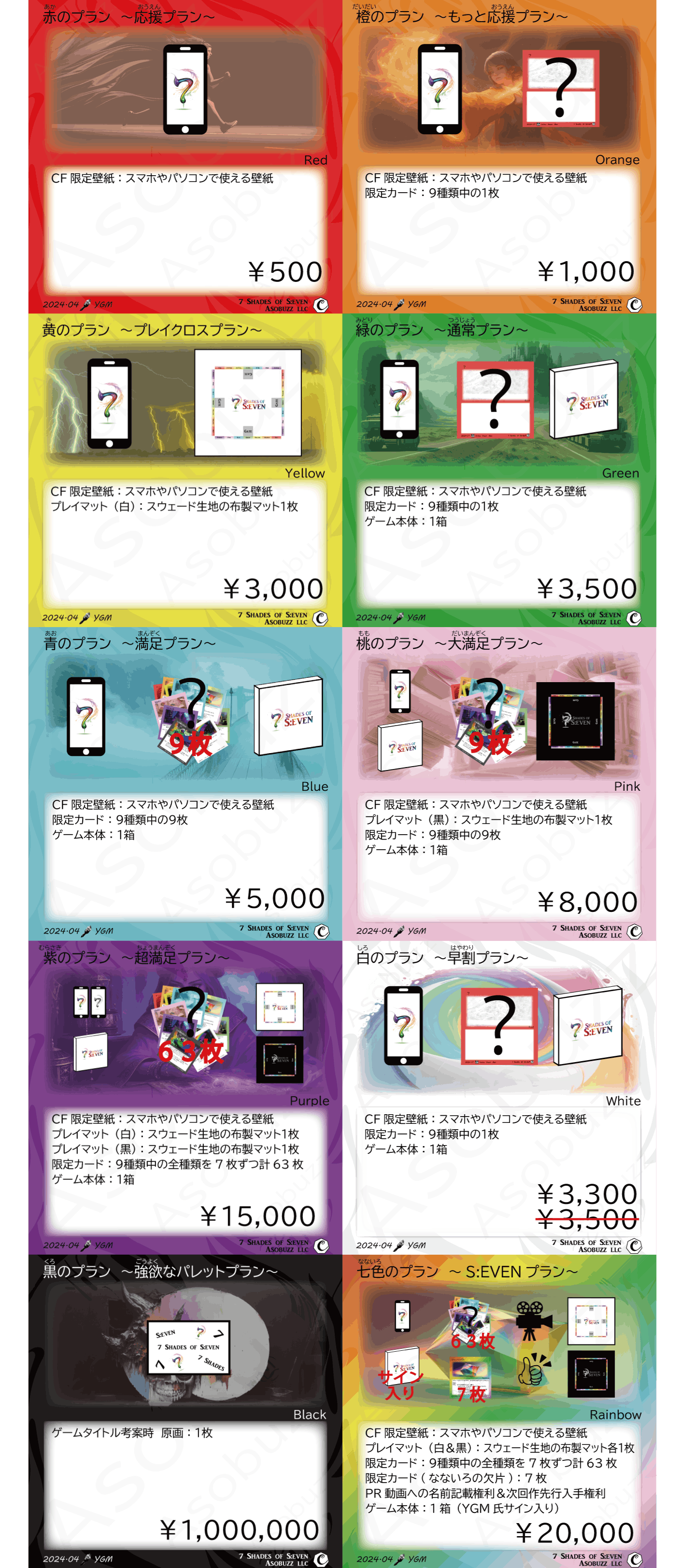 2024/09/06 18:05クラファン限定公開ページ↑↑↑ クリック ↑↑↑「お気に入り」ボタンを押していただけると励みになります!皆様、大変ご無沙汰しております。7 SHADES OF S:EVEN -シェイズオブセブン- 製作者のYGMです。この度、皆様の多大なるご支援のおかげでこのセブンが広く認知され、多くの方にセブンをプレイしていただくことができました。また、そのプレイされた方々から多くのご好評の声をいただいております(プレイ感想集)。そ、こ、で!なんと、なんとですよ、大変お待たせいたしましたが皆様からのご好評により、シェイズオブセブン『0th EDITION』 の続編となる『1st EDITION』のクラウドファンディングのプロジェクト始動が決定いたしました。今回は「青」のエディションです。0th EDITIONの【追色】効果に続き【財力】と【状況】効果が追加されています。また、「こんな遊び方があったなんて!」と驚くこと間違いありません。セブンの無限の可能性をいち早く皆様に体感していただきたい!そう思っています!まだまだ広告費にドカンとお金をかけられないのが現状です。しかし、皆様の口コミのおかげで日々セブンは着実に売れ続けております。セブンは皆様と一緒に少しづつドラマティックに成長していければと思っております。セブンを信じていただきありがとうございます。何卒、シェイズオブセブンをよろしくお願いいたします!!(^^♪クラファン限定公開ページ↑↑↑ クリック ↑↑↑「お気に入り」ボタンを 押していただけると 励みになります! もっと見る