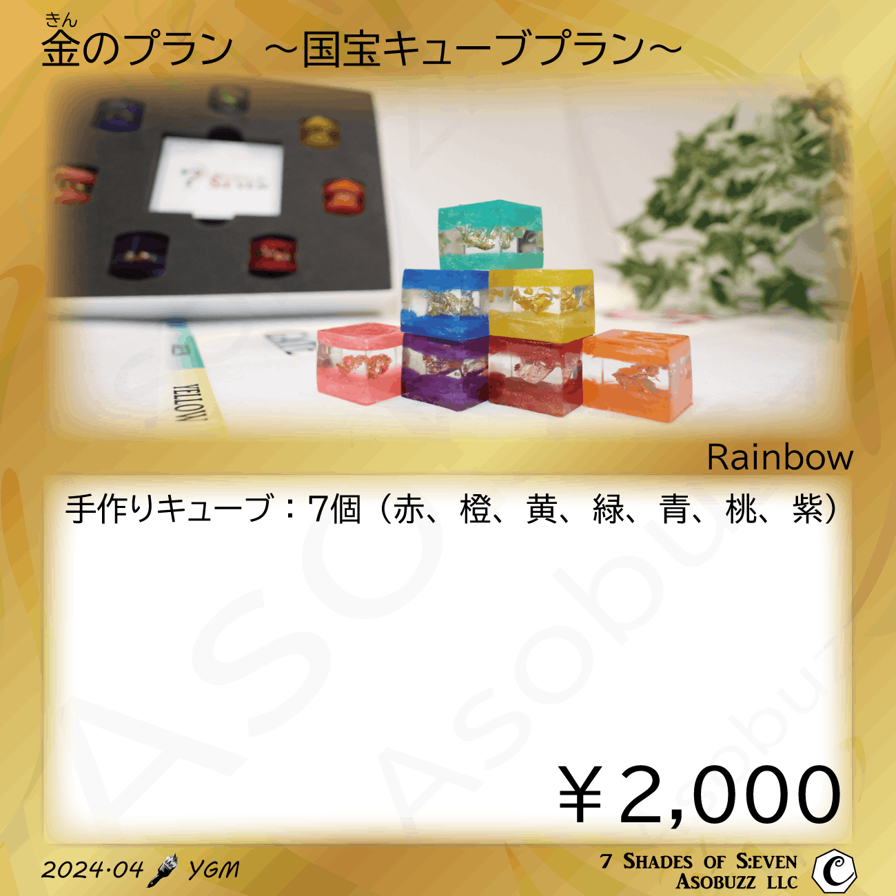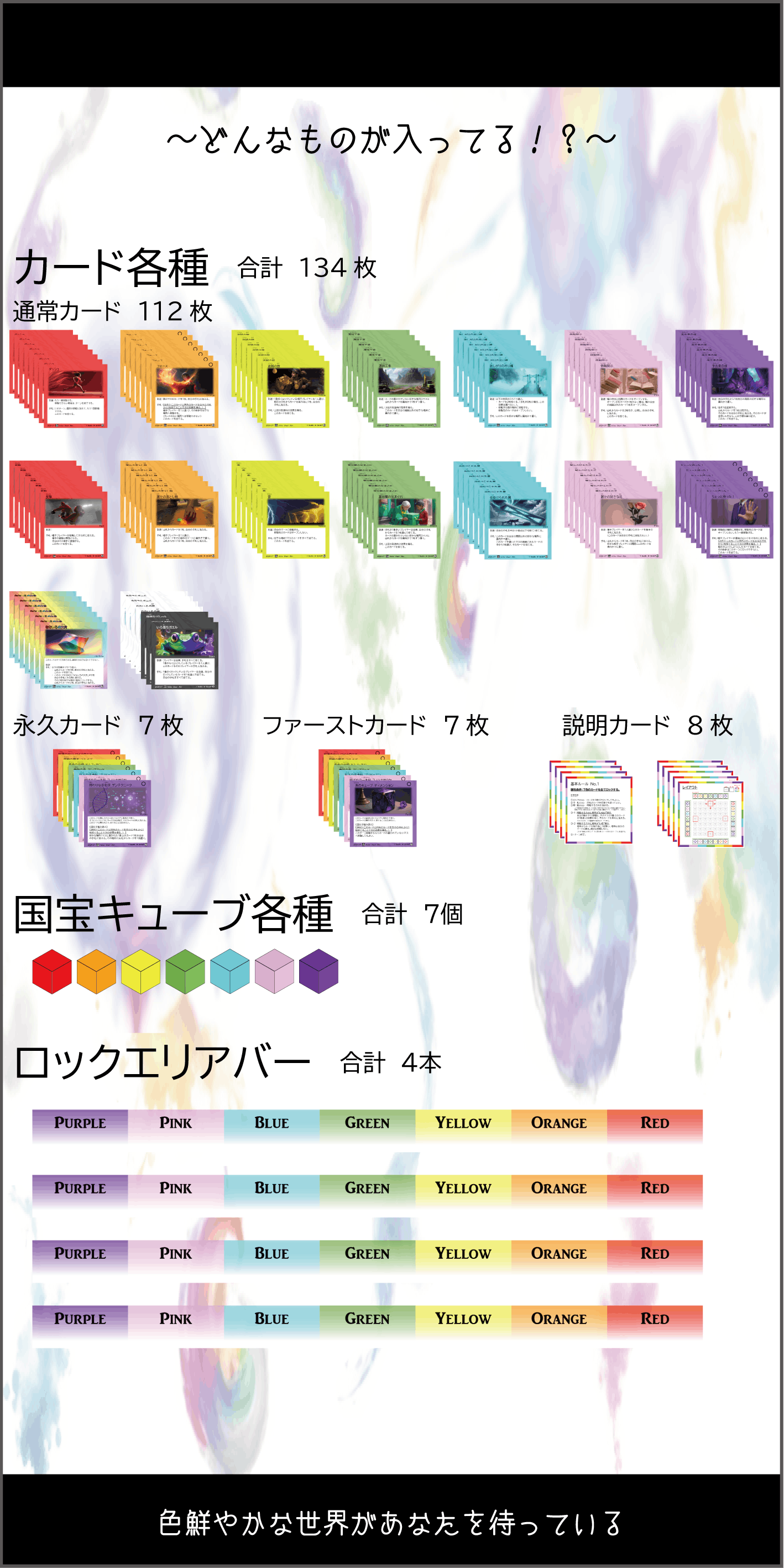 皆様へ感謝の気持ちを込めて追加のリターンになります。一つ一つ手作りで製作される美しいキューブをお贈りいたします。主な材質はレジンで、三層に分かれた構造になっております。サイズは約16mm×16mm×16mmの立方体となります。色は赤、橙、黄、緑、青、桃、紫、の7色で、各1色の計7個をお贈りいたします。7 SHADES OF S:EVENで使用できることはもちろん、飾るのにもおすすめです。また他のボードゲーム等にご使用いただくのもおすすめです。