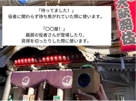 歌舞伎には様々な演技の型があり(見得を切る場面等)、そのような演技の見せ場をさらに盛り上げてくれるのが掛け声であるのです。私自身、贔屓の役者さんが出演される舞台を見る時に、ここで屋号を掛けたい!と思ったことはこれまでも多々ありました。
